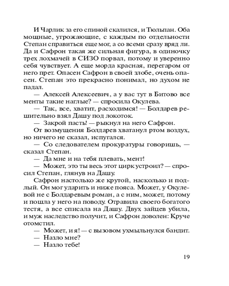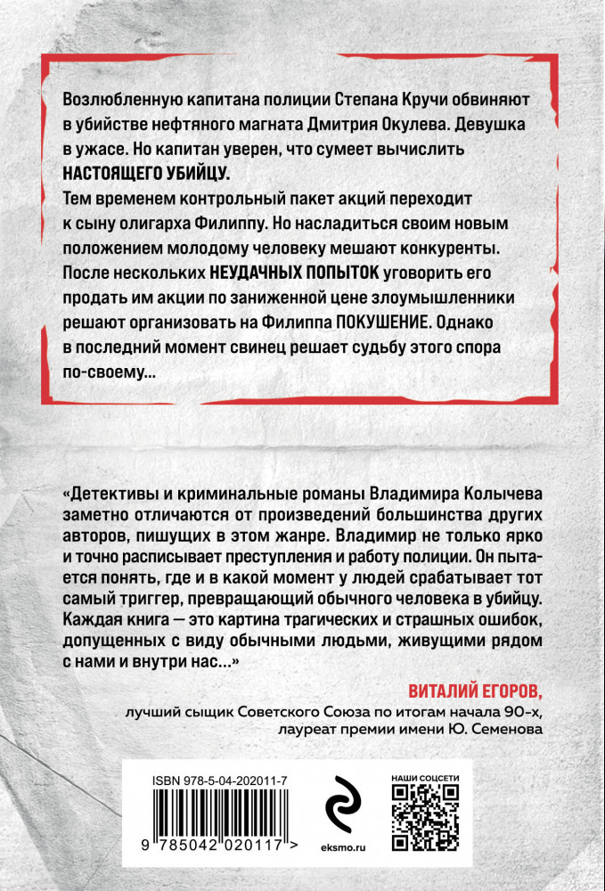 Серия: Колычев. Лучшая криминальная драма (обложка) Возлюбленную капитана полиции Степана Кручи обвиняют в убийстве нефтяного магната Дмитрия Окулева. Девушка в ужасе. Но капитан уверен, что сумеет вычислить настоящего убийцу. Тем временем контрольный пакет акций переходит к сыну олигарха Филиппу. Но насладиться своим новым положением молодому человеку мешают конкуренты. После нескольких неудачных попыток уговорить его продать им акции по заниженной цене злоумышленники решают организовать на Филиппа покушение. Однако в последний момент свинец решает судьбу этого спора по-своему... |