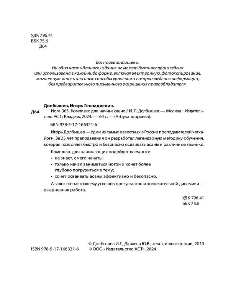 Серия: Азбука здоровья Игорь Долбышев — один из самых известных в России преподавателей хатха-йоги. За 25 лет преподавания он разработал легендарную методику обучения, которая позволяет быстро и безопасно осваивать асаны и различные техники. А залог по-настоящему успешных результатов и положительной динамики — ежедневная работа. |
