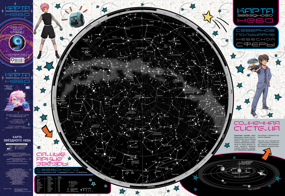 Серия: Карта (складная/бол) Складная двухсторонняя карта имеет размеры 680×990 мм. Звёздное небо показано в виде карт северного и южного полушарий небесной сферы. Именно так ночное небо с мерцающими на нём галактиками, туманностями и звёздными скоплениями можно увидеть с Северного и Южного полюсов Земли. Звёзды на карте ранжированы по видимой звёздной величине. Даны названия самых ярких звёзд и условные очертания всех 88 созвездий. Приведёны краткие сведения о Солнечной системе, небесной сфере, звёздных координатах, эклиптике и зодиакальном круге. Размеры карты в сложенном виде 110×227 мм. Карта будет полезна для всех, кто интересуется астрономией. А яркие и красочные изображения героев фильма «Сто лет тому вперед» превращают полезную и насыщенную информацией карту в красочный постер, который можно разместить на стене. Из какой галактики Алиса, как космеон попал в руки к Коле — изучая карту звездного неба, вспоминай фильм и его героев, фантазируй. Твое виртуальное путешествие по созвездиям сможет вместить восхищение, удивление и массу других положительных эмоций, связанных с изучением карты звездного неба. |