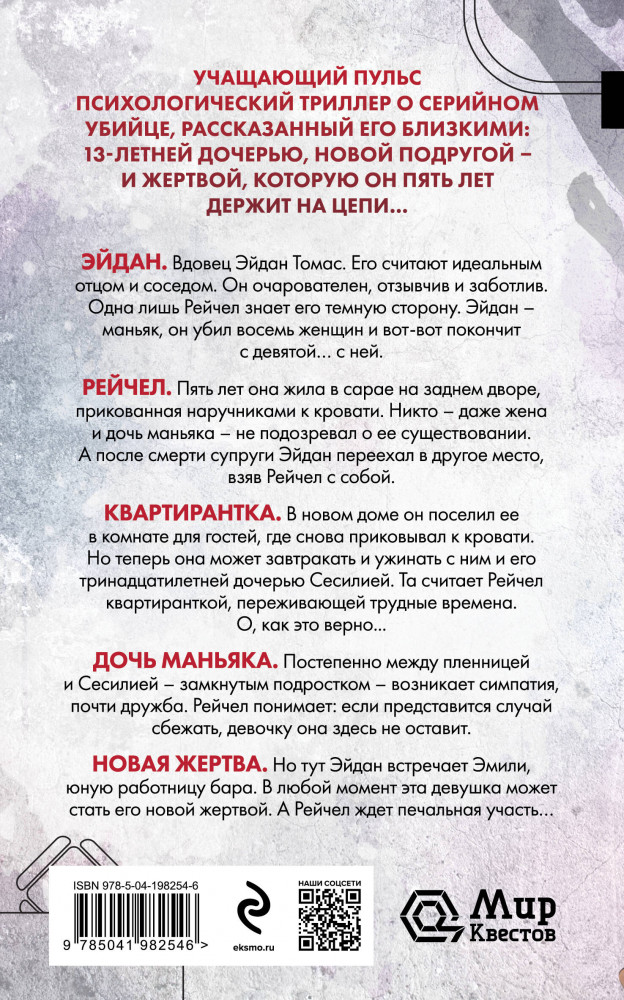 Серия: Главный триллер года (обложка с клапанами) Учащающий пульс психологический триллер о серийном убийце, рассказанный его близкими: 13-летней дочерью, новой подругой — и жертвой, которую он пять лет держит на цепи... |