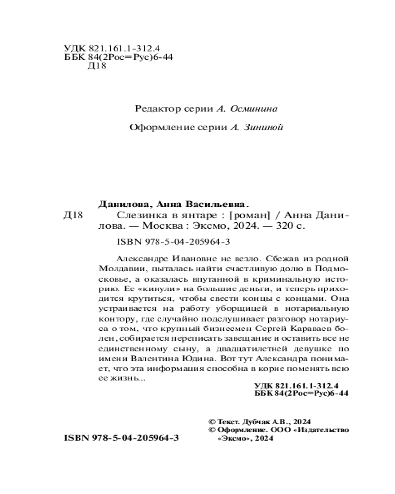 Серия: Эффект мотылька. Детективы Анны Даниловой. Новые расследования (обложка) Александре Ивановне не везло. Сбежав из родной Молдавии, пыталась найти счастливую долю в Подмосковье, а оказалась впутанной в криминальную историю. Ее «кинули» на большие деньги, и теперь приходится крутиться, чтобы свести концы с концами. Она устраивается на работу уборщицей в нотариальную контору, где случайно подслушивает разговор нотариуса о том, что крупный бизнесмен Сергей Караваев болен, собирается переписать завещание и оставить все не единственному сыну, а двадцатилетней девушке по имени Валентина Юдина. Вот тут Александра понимает, что эта информация способна в корне поменять всю ее жизнь... |