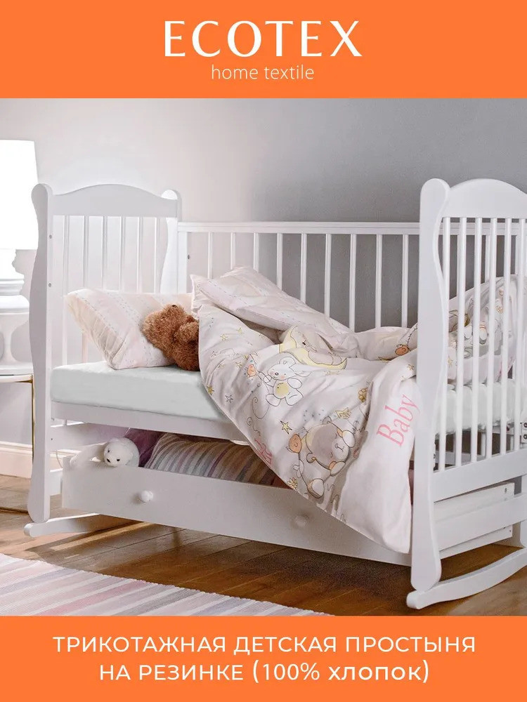 Для трикотажного полотна характерны растяжимость, эластичность и мягкость. Нежное прикосновение к телу бархатного на ощупь хлопка, мягкая фактура полотна — вот основное преимущество трикотажных простыней на резинке для детей. Они практичны в уходе, не требуют глажения после стирки, мягкие, экологичные, защищают матрас от загрязнений.