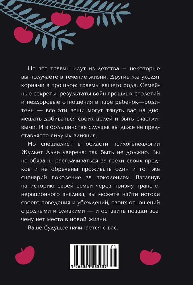 💳 Оплатить за товар можно при получении 🇰🇿 Есть бесплатная доставка по Казахстану 🎁 Копите бонусы с каждой покупки Серия: Популярная психология для бизнеса и жизни Не все травмы идут из детства — некоторые вы получаете в течение жизни. Другие же уходят намного глубже в прошлое: травмы вашего рода. Семейные секреты, результаты войн прошлых столетий и нездоровые отношения в паре ребенок-родитель — все эти вещи могут тянуть вас на дно, мешать добиваться своих целей и быть счастливыми. И в большинстве случаев вы даже не представляете силу их влияния. Но специалист в области психогенеалогии Жульет Алле уверена: так быть не должно. Вы не обязаны расплачиваться за грехи своих предков и не обречены проживать один и тот же сценарий поколение за поколением. Взглянув на историю своей семьи через призму трансгенерационного анализа, вы можете найти истоки своего поведения и убеждений, своих отношений с родными и близкими — и оставить позади все, чему нет места в новой жизни. Ваше будущее начинается с вас. генетика, исследование, история жизни, наследственность, научно-популярная литература, отношения, психология, семейные отношения, семейные тайны, семья. |