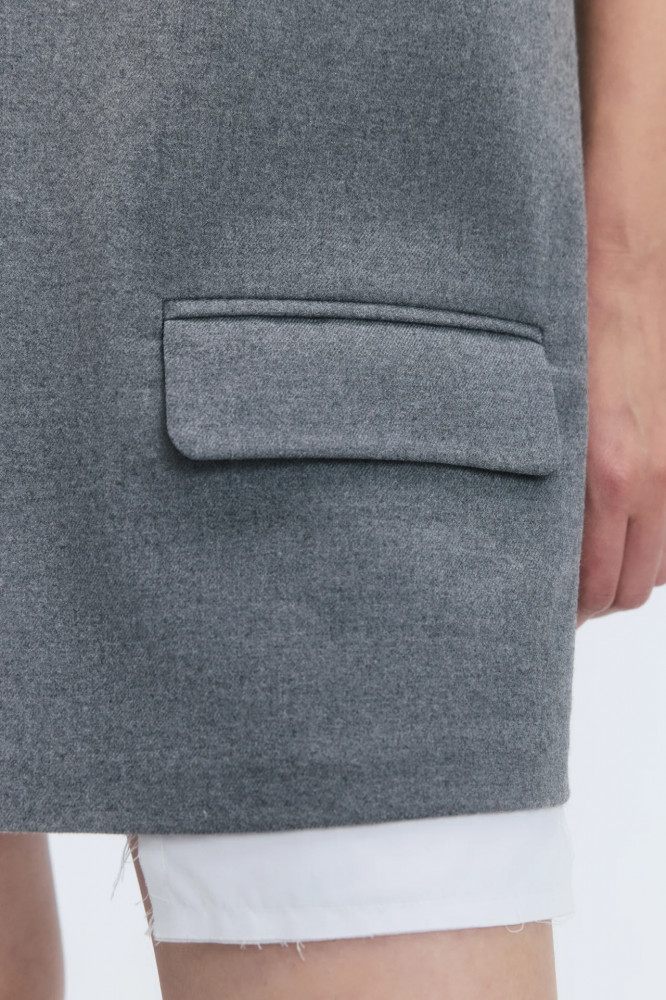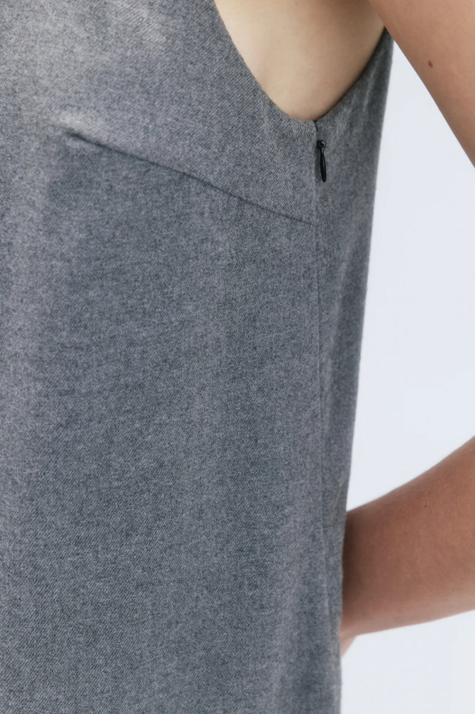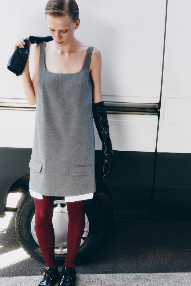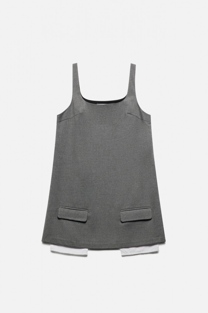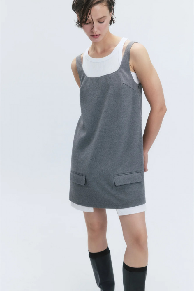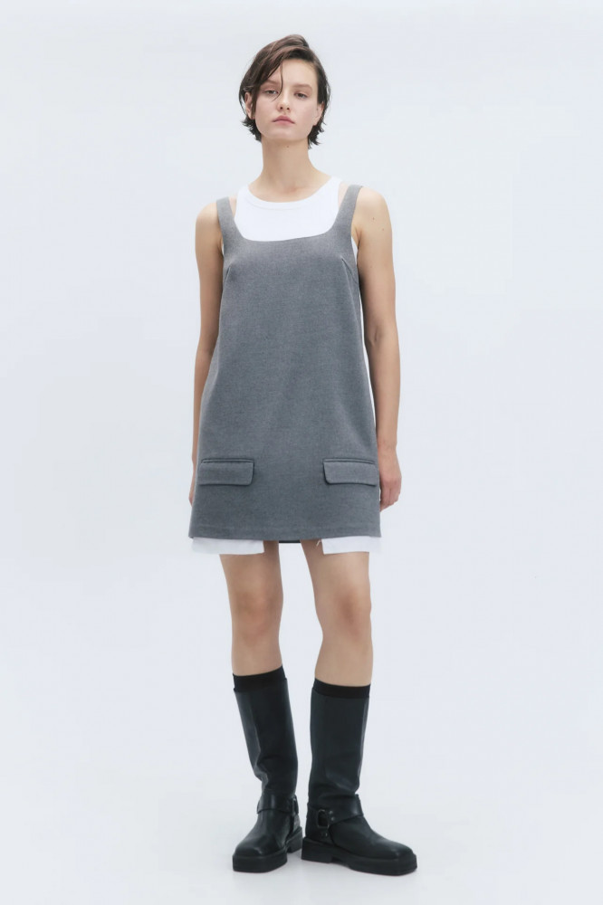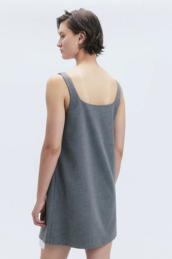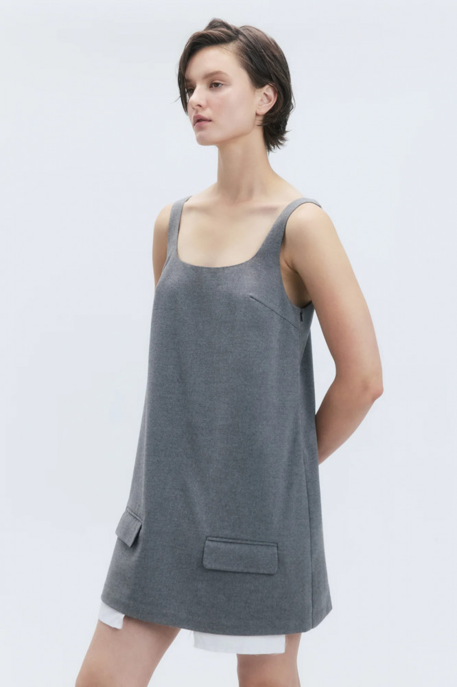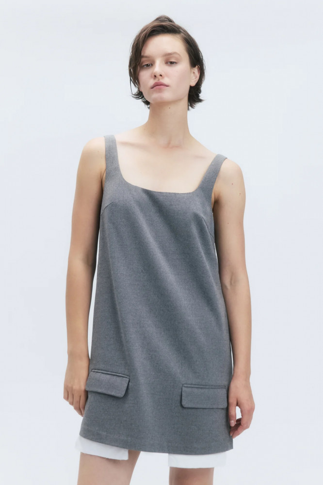 Короткое женское платье-сарафан мини кроя А-силуэт из приятной к телу, мягкой, гладкой костюмной ткани с добавлением вискозы. Глубокий вырез горловины каре, низкая линия спинки. Широкие нерегулируемые бретели, широкие проймы под рукава. Застежка на боковую молнию. Прорезные карманы с клапанами, торчащие из-под юбки, будто ты сама решила укоротить любимый сарафан. Декоративные швы на груди. Серый костюмный сарафан-трапеция с карманами. Идеальный однотонный сарафан в школу, университет или офис. Носи его поверх рубашек или лонгсливов, примерь в дерзком сочетании с брюками. Создавай с ним комфортные образы на каждый день. Сарафан станет базой твоих образов в стиле смарт-кэжуал, городской шик или просто повседневных образов. Носи платье без рукавов отдельно или в составе многослойных образов. Заверши образ удобной обувью или любимыми аксессуарами.