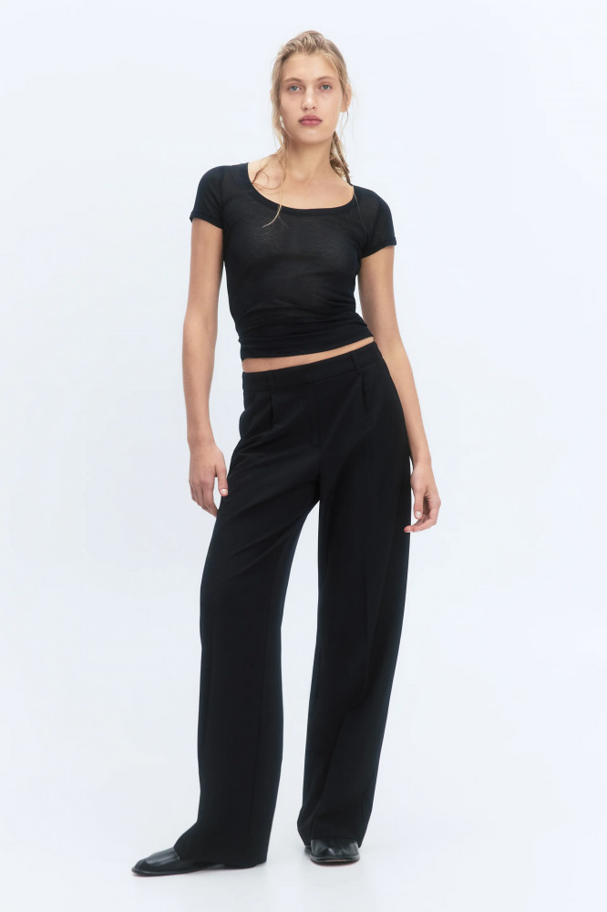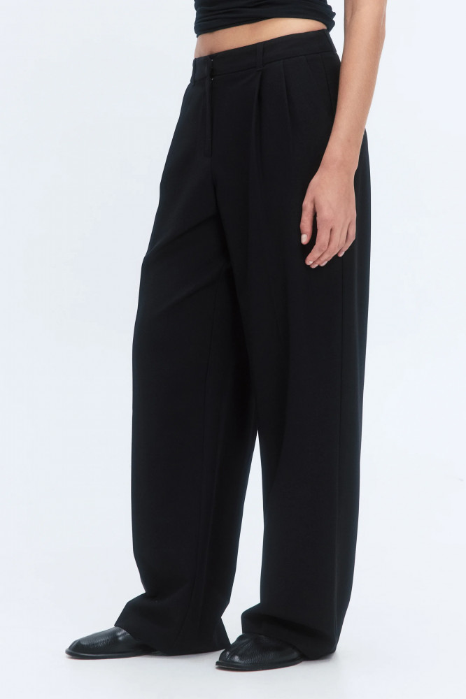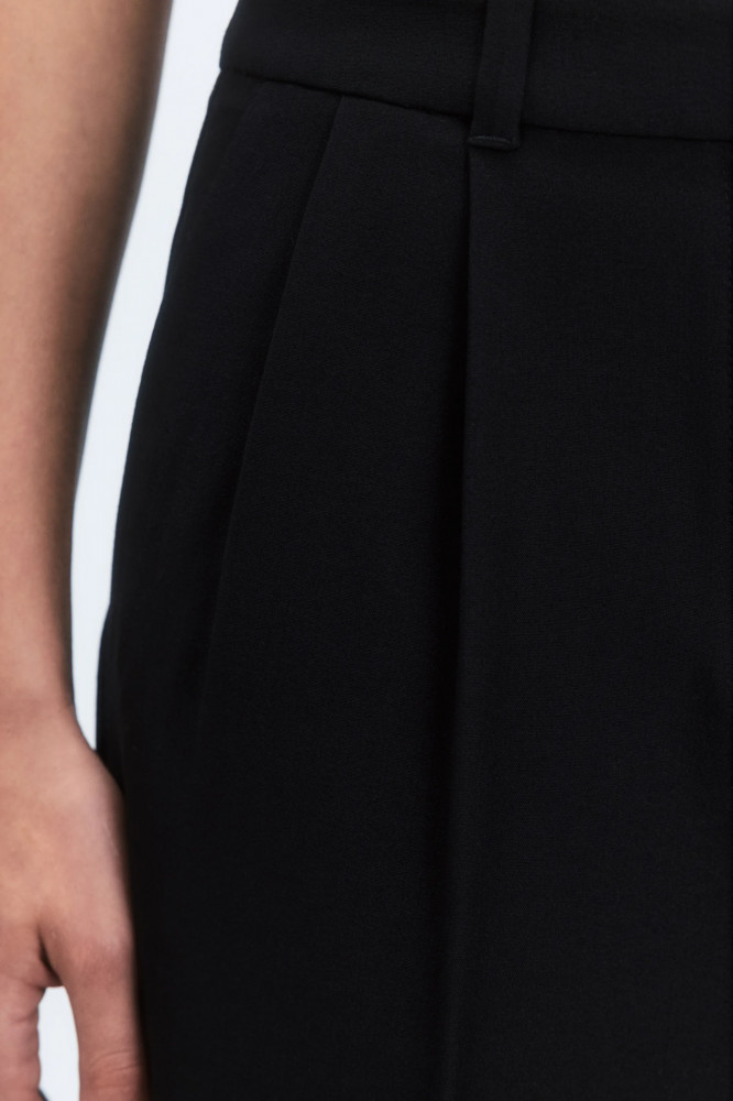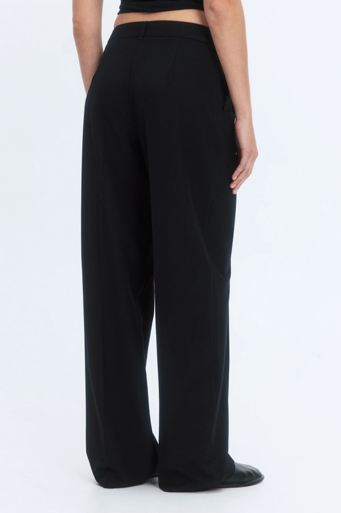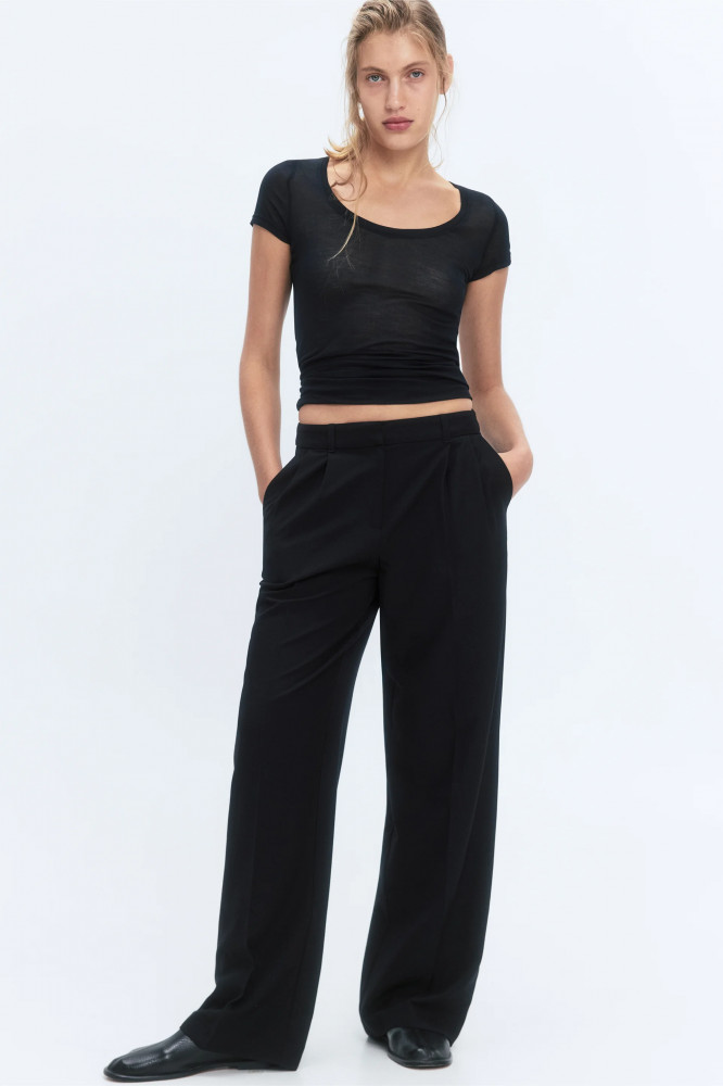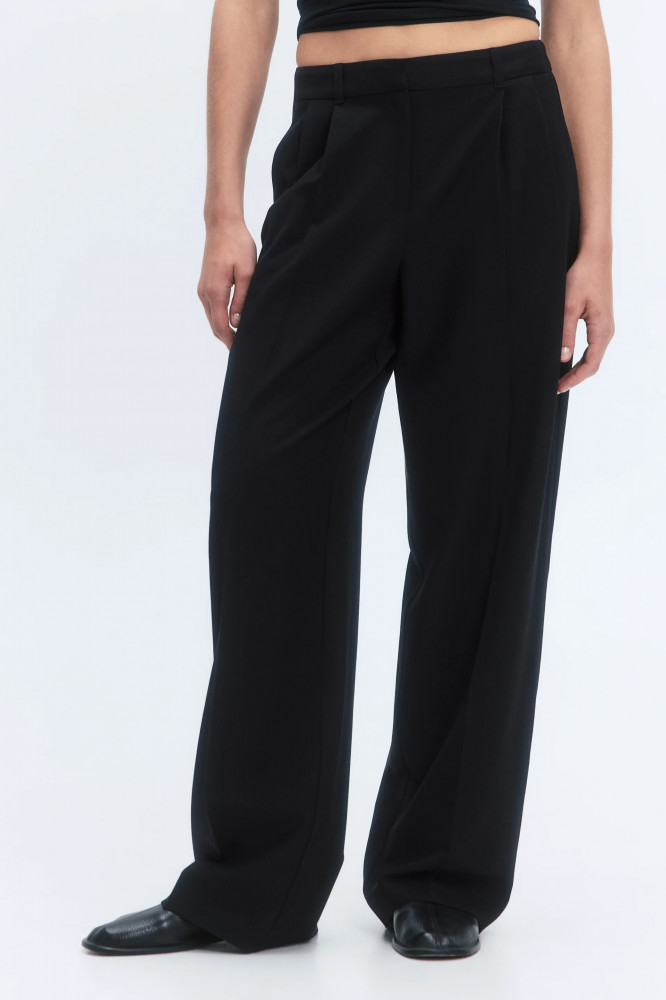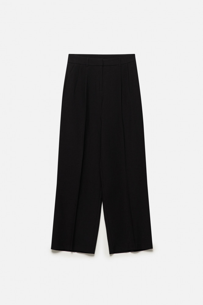Широкие женские брюки из мягкой и очень приятной к телу костюмной ткани с добавлением вискозы с гладкой текстильной фактурой. Высокая посадка по талии, подчеркивающая фигуру и скрывающая недостатки. Застежка на молнию и потаенный крючок спереди, шлевки для ремня, два боковых кармана с отрезным бочком. Длинные прямые штанины со стрелками и складками на поясе. Однотонные черные костюмные брюки из мягкой ткани для привлекательных и женственных аутфитов в школу, университет, офис или просто на каждый день. Дополни их своим любимым верхом для расслабленных повседневных луков или однотонной блузкой с пиджаком для более строгих и сдержанных официальных образов. Легкие костюмные брюки-палаццо широкого кроя составят идеальную основу твоего гардероба и идеально подойдут на любое время года, а за счет удлиненных штанин подойдут также для высоких девушек.