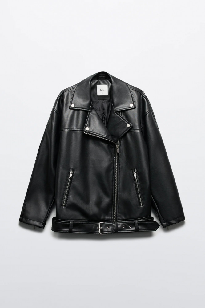 Однотонная черная косуха с кожаной фактурой для стильных аутфитов в байкерском стиле или для повседневных луков. Стильная и универсальная куртка-косуха, которая защитит тебя от ветра и дождя и подойдет как на прохладное лето, так и на раннюю осень / позднюю весну. Создавай образы в стиле гранж или панк-рок. Добавь к образам денимный рваный низ или создай тотал-лук из кожи. Закончи образ массивной обувью и стильными очками-авиаторами. Сочетай косуху с разными фактурами: шифоном, кружевом, атласом.