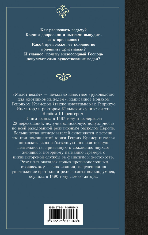 Серия: Лучшая мировая классика «Молот ведьм» — печально известное «руководство для охотников на ведьм», написанное монахом Генрихом Крамером (также известным как Генрикус Инститор) и ректором Кёльнского университета Якобом Шпренгером. Книга вышла в 1487 году и выдержала 29 переизданий, получив одинаковую популярность по всей разодранной религиозным расколом Европе. Большинство исследователей склоняются к версии, что при помощи этой книги Генрих Крамер пытался оправдать свою собственную инквизиторскую деятельность, приведшую к сожжению двухсот женщин и позорному изгнанию Крамера с инквизиторской службы за фанатизм и жестокость. Результат оказался прямо противоположным ожидаемому — инквизиция, нацеленная на уничтожение еретиков и религиозных вольнодумцев, осудила в 1490 году самого автора. |