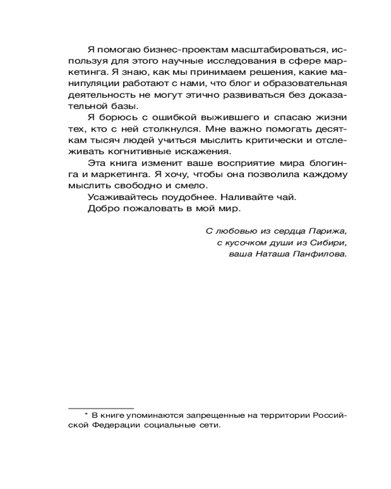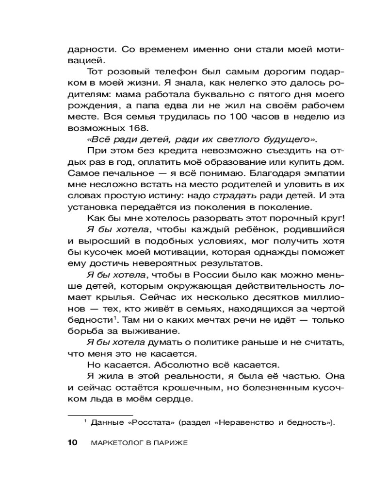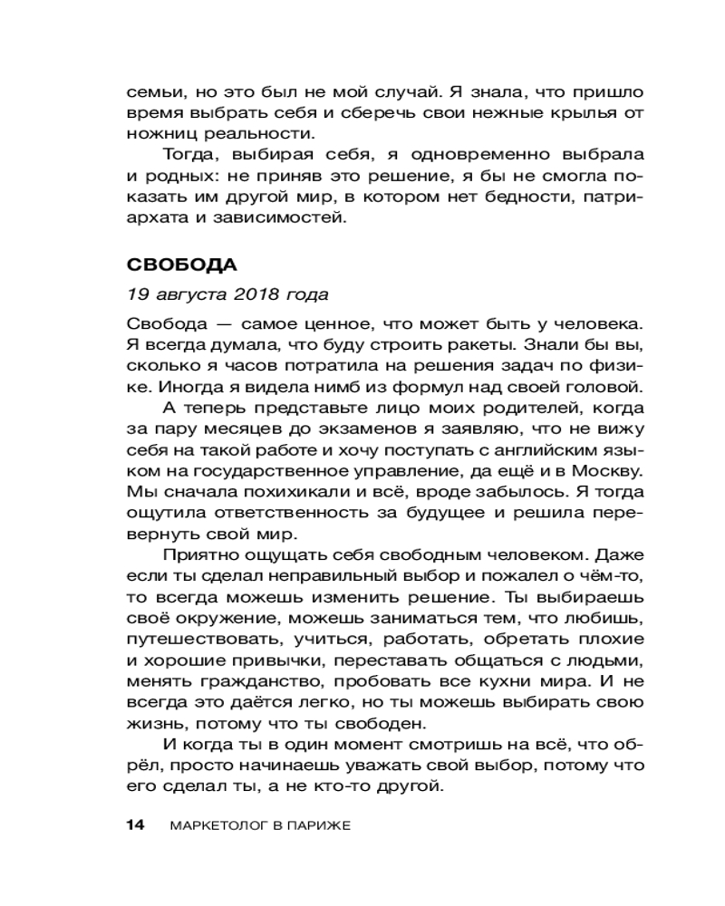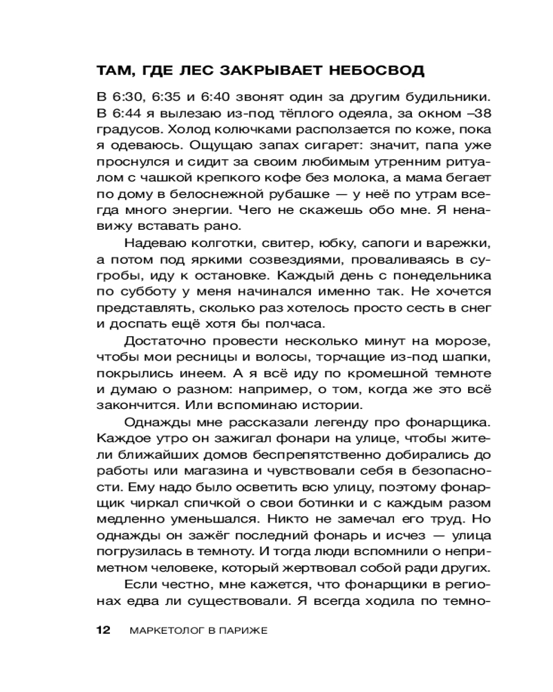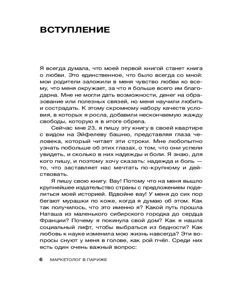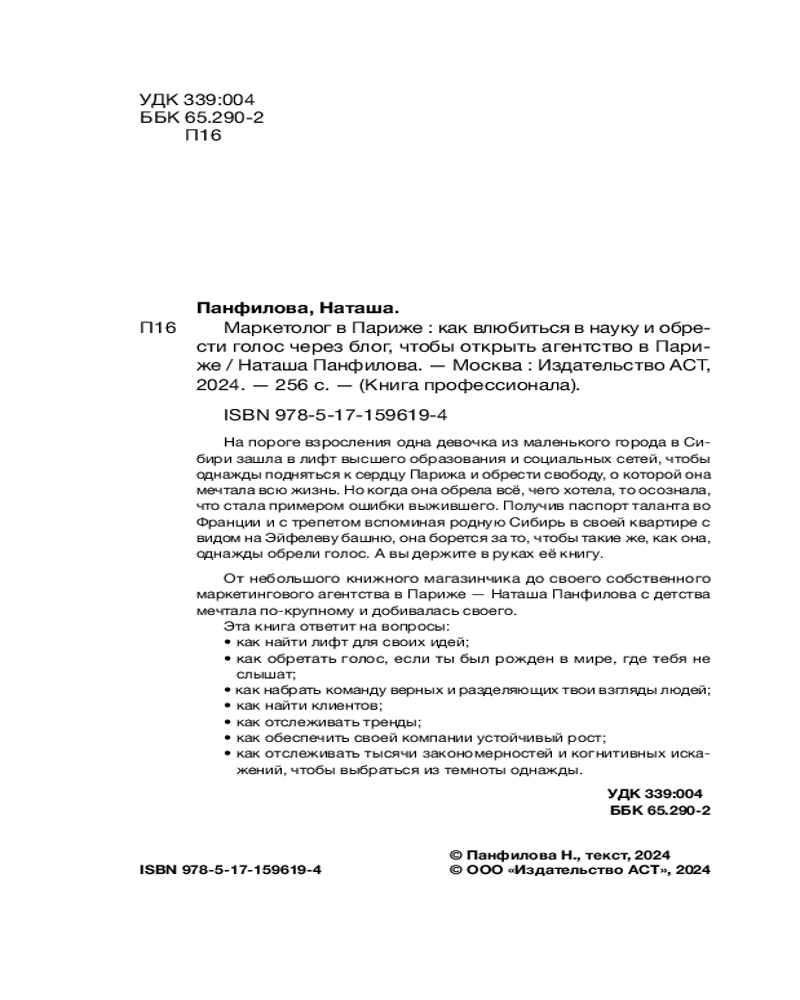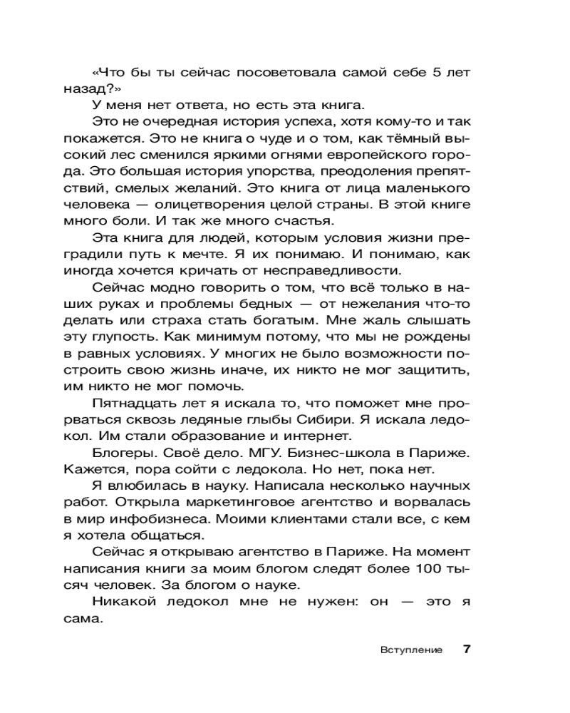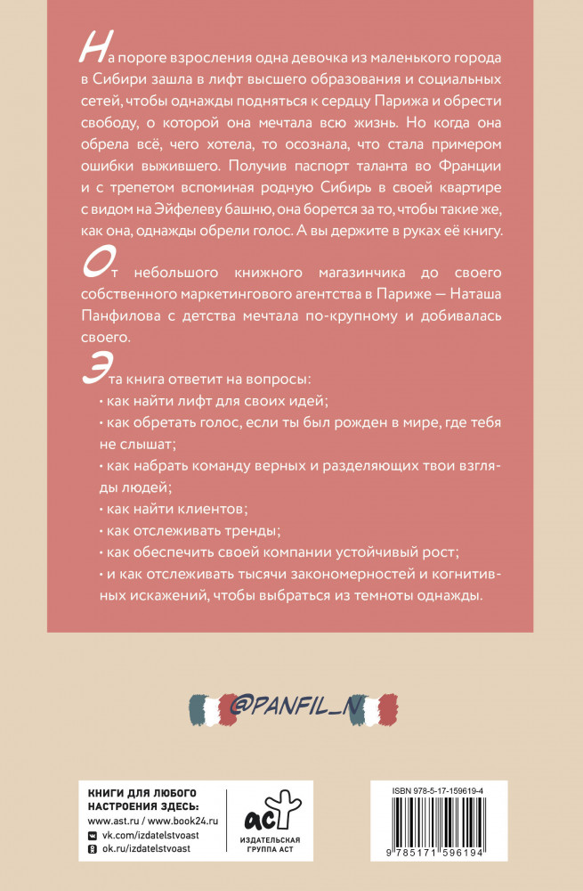 Серия: Книга профессионала На пороге взросления одна девочка из маленького города в Сибири зашла в лифт высшего образования и социальных сетей, чтобы однажды подняться к сердцу Парижа и обрести свободу, о которой она мечтала всю жизнь. Но когда она обрела всё, чего хотела, то осознала, что стала примером ошибки выжившего. Получив паспорт таланта во Франции и с трепетом вспоминая родную Сибирь в своей квартире с видом на Эйфелеву башню, она борется за то, чтобы такие же, как она, однажды обрели голос. А вы держите в руках её книгу. |