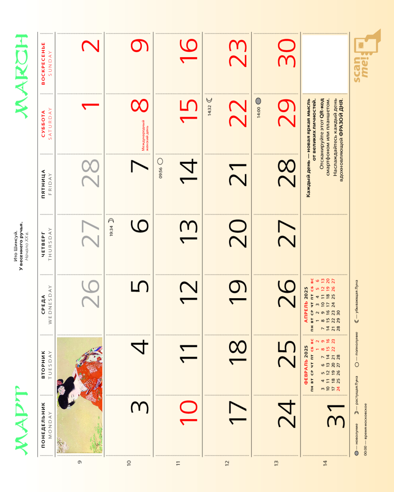 Календарь настенный на 2025 год «Шедевры японского искусства»В данный момент этот товар отсутствует в продаже. Возможно, у нас найдется аналогичный или похожий товар здесь. Серия: Календари настенные 2025 (300×300) В этом настенном перекидном календаре на 2025 год представлены знаменитые картины великих японских художников. Повесьте этот календарь в своем доме или на рабочем месте, и он достойно украсит любой интерьер. А календарный блок напомнит о важных событиях года. В центре календаря помещен большой арт-постер, который может стать отдельным декоративным украшением интерьера. |