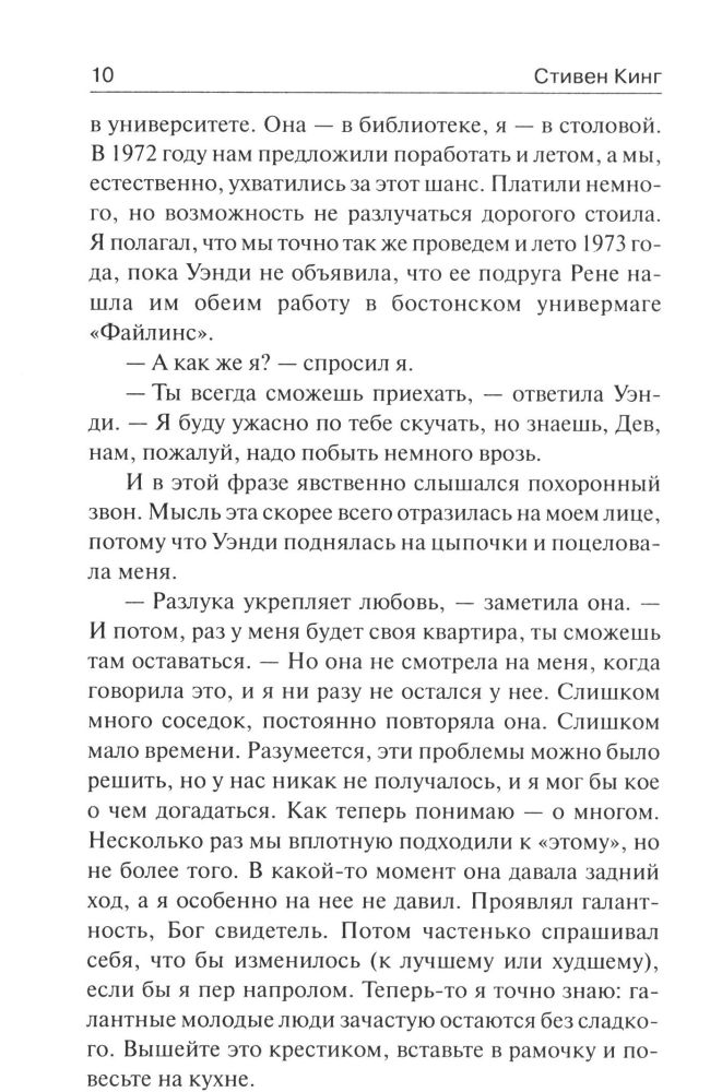 Книга самая спокойная из всех произведений Кинга! Ждешь и ждешь когда же наконец начнется ужасный трепет, которым сопровождается все произведения автора, а он все не приходит. Книга это обеспечит спокойное и легкое чтение. Она просто идеально пополнит коллекцию фанатов Кинга! Обложка яркая, страницы белые, качество хорошее!!