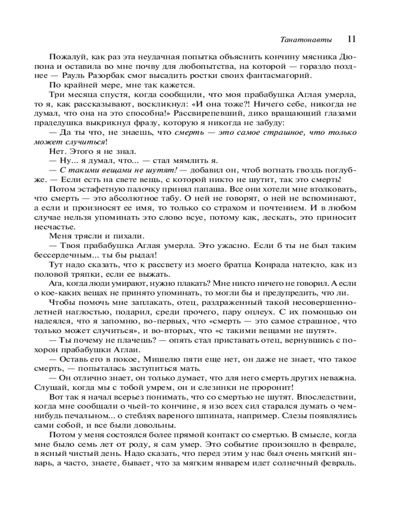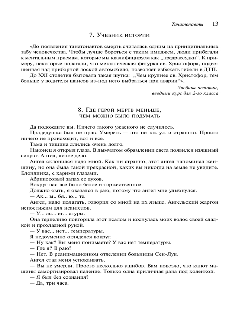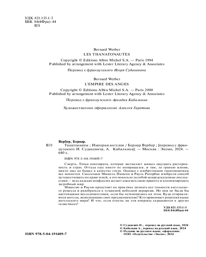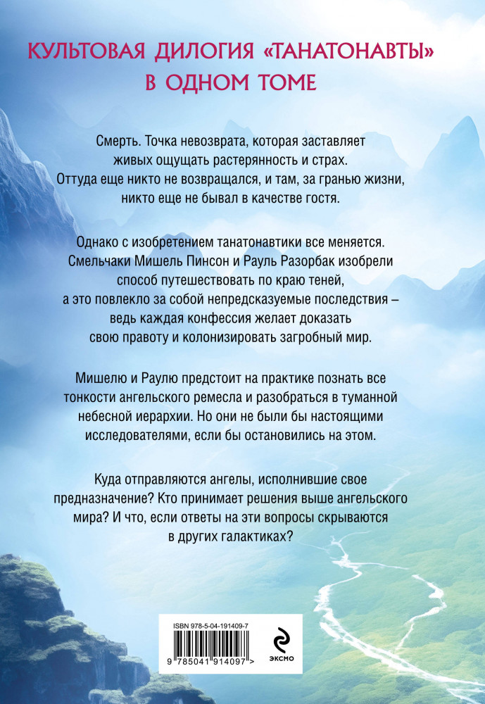 Танатонавты. Империя ангеловВ данный момент этот товар отсутствует в продаже. Возможно, у нас найдется аналогичный или похожий товар здесь. Серия: Бесконечная вселенная Бернара Вербера в одном томе Смерть. Точка невозврата, которая заставляет живых ощущать растерянность и страх. Оттуда еще никто не возвращался и там, за гранью жизни, никто еще не бывал в качестве гостя. Однако с изобретением танатонавтики все меняется. Смельчаки Мишель Пинсон и Рауль Разорбак изобрели способ путешествовать по краю теней, а это повлекло за собой непредсказуемые последствия — ведь каждая конфессия желает доказать свою правоту и колонизировать загробный мир. |