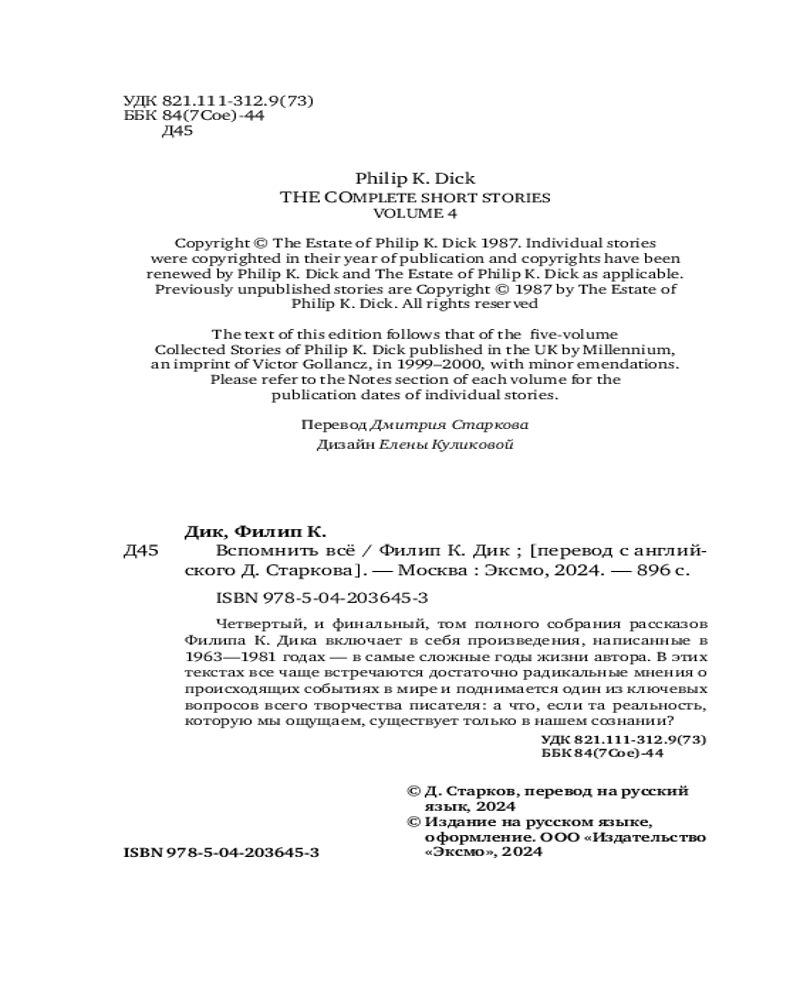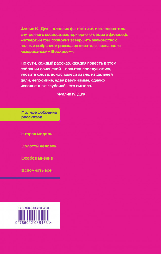 💳 Оплатить за товар можно при получении 🇰🇿 Есть бесплатная доставка по Казахстану 🎁 Копите бонусы с каждой покупки Серия: Fanzon. Филип К. Дик. Коллекция рассказов Четвертый и финальный том полного собрания рассказов Филипа К. Дика включает в себя произведения, написанные в 1963-1981 годах — в самые сложные годы жизни автора. В этих текстах все чаще встречаются достаточно радикальное мнения о происходящих событиях в мире и поднимается один из ключевых вопросов всего творчества писателя: а что, если та реальность, которую мы ощущаем, существует только в нашем сознании? |