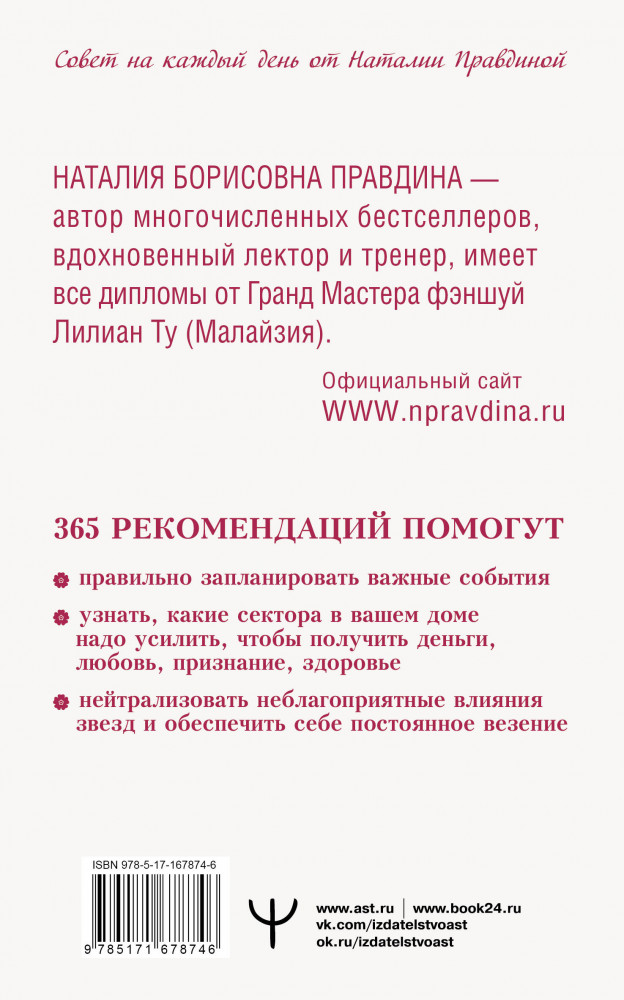 Золотой календарь фэншуй на 2025 год. 366 очень важных предсказаний. Стань богаче и счастливее с каждым днем!В данный момент этот товар отсутствует в продаже. Возможно, у нас найдется аналогичный или похожий товар здесь. Серия: Совет на каждый день от Натальи Правдиной Древняя китайская пословица гласит: «На первом месте — судьба, на втором месте — удача, на третьем — фэншуй». |