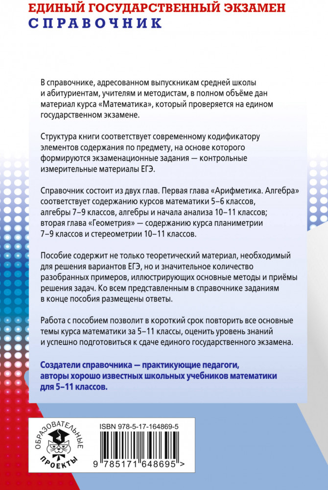 Серия: Самый популярный справочник для подготовки к ЕГЭ Справочник содержит материал курса «Математика» в объёме, проверяемом на едином государственном экзамене. Структура книги соответствует современному кодификатору элементов содержания по предмету, на основе которого формируются экзаменационные задания — контрольные измерительные материалы ЕГЭ. Справочник состоит из двух глав: «Арифметика. Алгебра» и «Геометрия». Помимо теоретического материала в справочнике представлено значительное количество разобранных примеров, иллюстрирующих основные методы и приёмы решения задач. Ко всем заданиям в конце пособия даны ответы для самопроверки. Работа с пособием позволит повторить все основные темы курса математики за 5–11 классы и успешно подготовиться к сдаче ЕГЭ. |