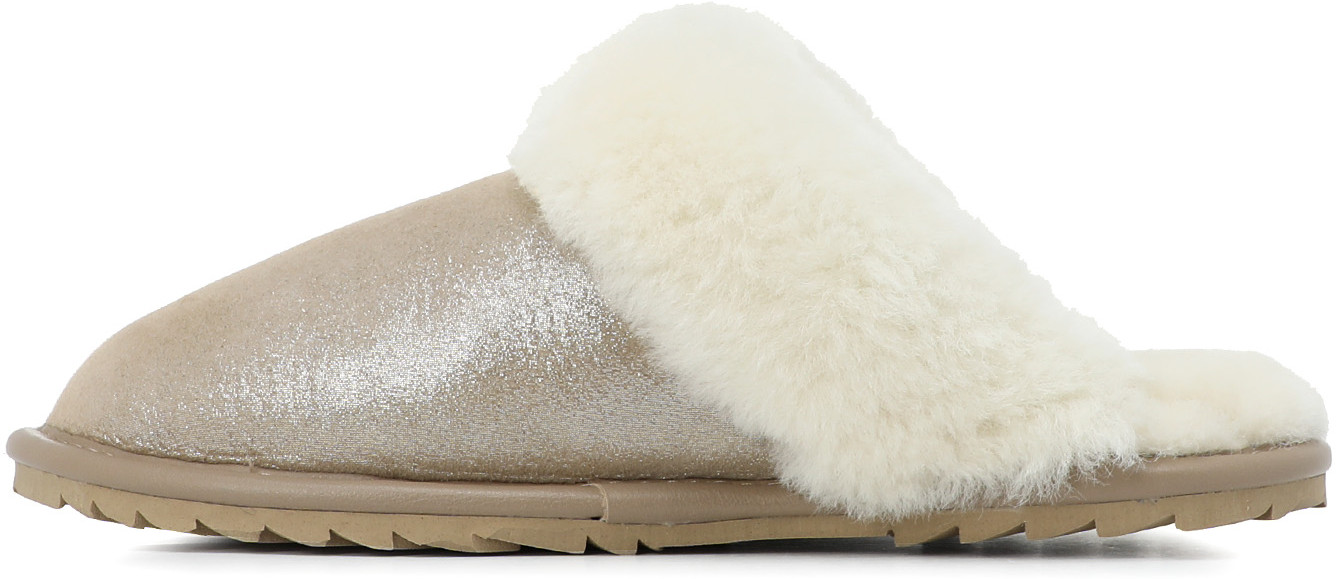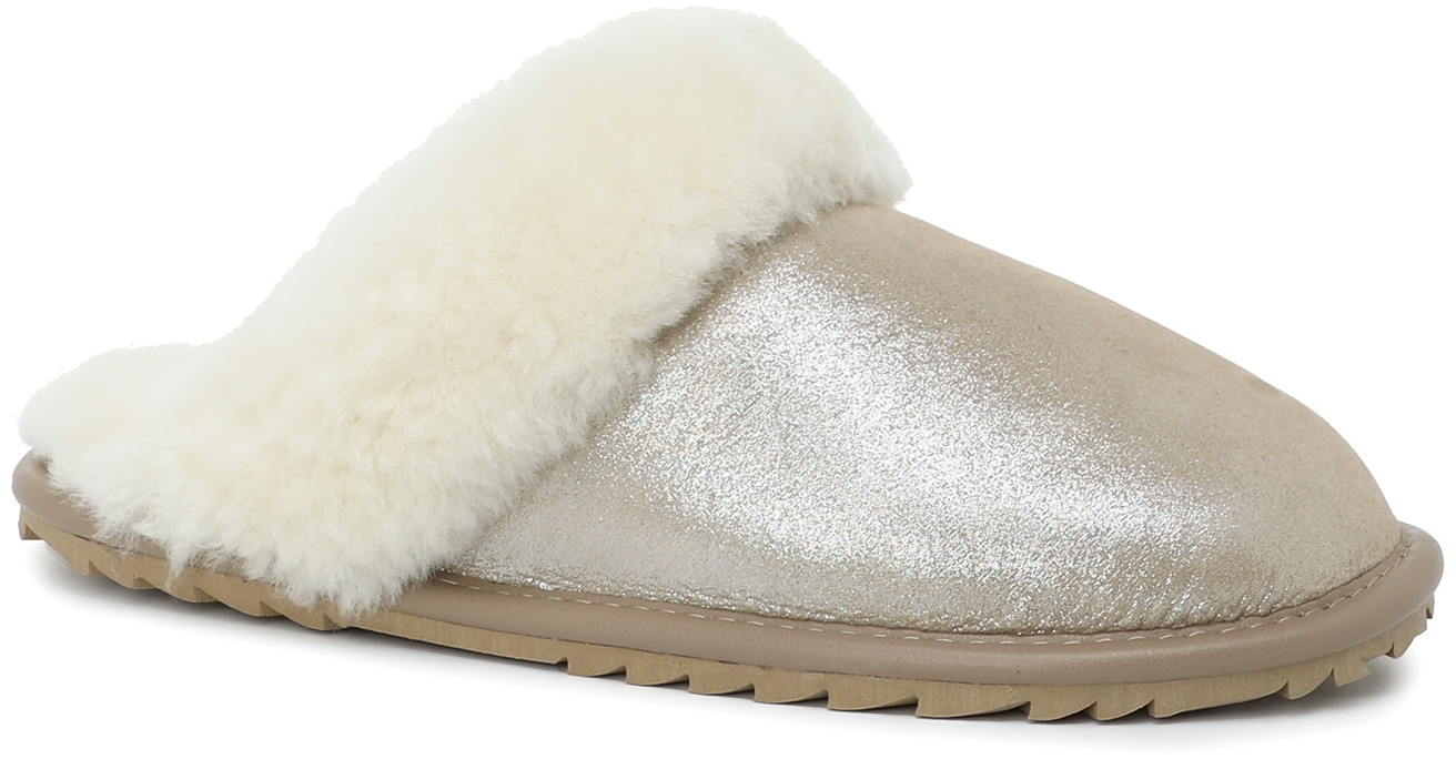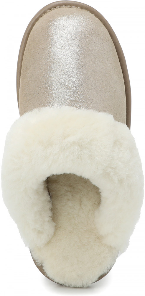 Верх модели выполнен из натуральной замши дубльфас из овечьей кожи — мягкого и эластичного материала, приятного на ощупь и хорошо удерживающего тепло. Обработка материала верха — штампованная, металлик. Меховой ворот придаёт обуви воздушный и уютный внешний вид. Подкладка и стелька из натурального меха обеспечат вам абсолютный комфорт даже в холодном помещении. Мех мягкий и приятный на ощупь, он помогает сохранить здоровье ваших ног благодаря своим природным антибактериальным свойствам. Ноги будут дышать, оставаясь сухими и тёплыми. Резиновая подошва прочная и устойчивая к истиранию, а рисунок протектора уменьшает риск поскользнуться. Толщина подошвы — 0,7 см, способ соединения подошвы — клеевой.