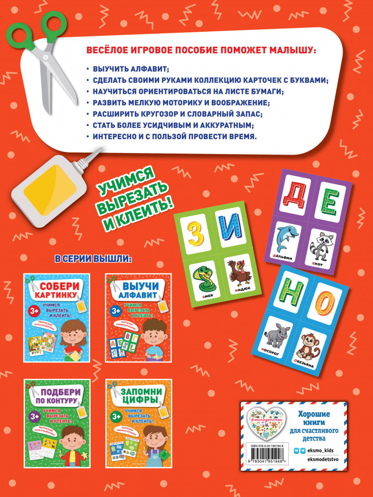 Серия: Учимся вырезать и клеить Книга-вырезалка большого формата с забавными цветными-картинками — это не только увлекательное игровое пособие для детей, но и полезный инструмент для развития у малыша мелкой моторики, воображения и творческих способностей. Сначала ребёнку предстоит запомнить образ буквы. Он сможет самостоятельно сделать карточки с буквами и животными, собрав свою первую весёлую азбуку. Кроме того, занимаясь, ребёнок станет более усидчивым, аккуратным, внимательным и организованным, а главное, положительно настроенным к обучению и уверенным в себе. Все эти навыки позволят ему в дальнейшем реализовать все свои таланты. Адресовано родителям и воспитателям любознательных дошкольников и может быть использовано для занятий как в детском саду, так и дома с мамой. |