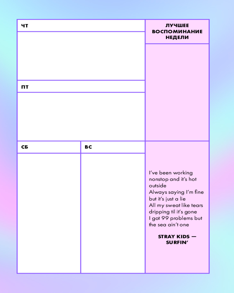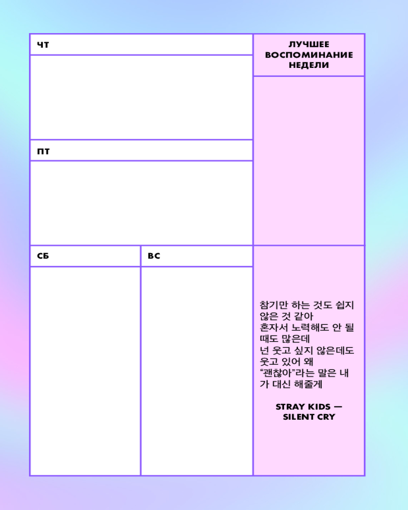 Серия: Ежедневники недатированные контентные Яркий и крутой ежедневник с айдолами из Stray Kids! Ежедневник, который поможет справиться с любой задачей, распланировать все дела и поднимет настроение своей стильной обложкой. Иллюстрации на ней были созданы художницей мяско. На красочных разворотах на неделю удобно записывать планы, задачи на каждый день, отслеживать привычки. Каждый разворот украшают строчки из песен группы и забавные фразы от ее участников! Отличный подарок фанату! |