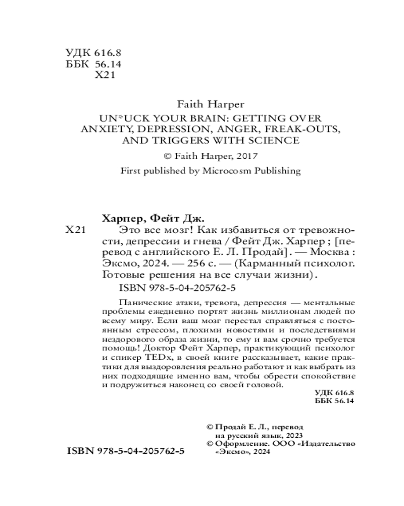 Серия: Карманный психолог. Готовые решения на все случаи жизни Паническая атака по дороге на работу, тревога из-за срыва дедлайнов, ссора с партнером, бессонница из-за депрессивных мыслей о будущем... Если для вас это обычный вторник, то ваш бедный мозг уже на грани нервного срыва и нуждается в помощи! Доктор Фейт Харпер, практикующий психолог, автор бестселлеров и спикер TEDx, доступно и с юмором объясняет, как работает мозг и почему мы легко впадаем в депрессию или зависимость, нервничаем из-за пустяков, срываем злость на близких — и как выйти из этого порочного круга. |