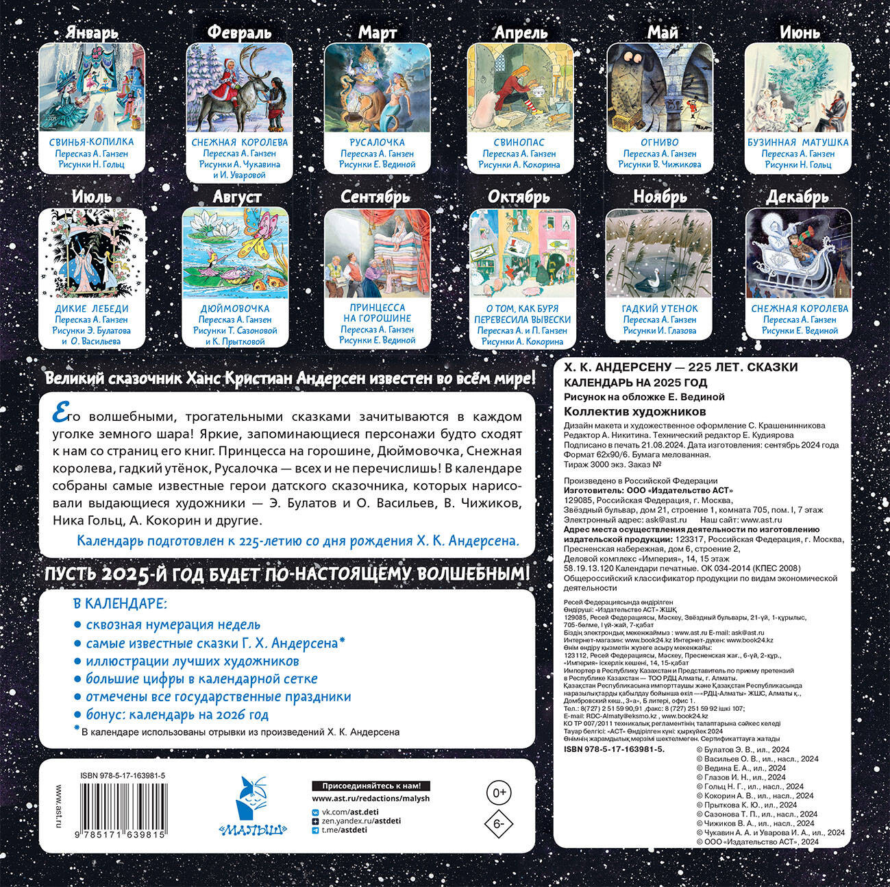 Календарь детский на 2025 год «Сказки Х. К. Андерсена. 225 лет»В данный момент этот товар отсутствует в продаже. Возможно, у нас найдется аналогичный или похожий товар здесь. Серия: Календарь детский 2025 Великий сказочник Ханс Кристиан Андерсен известен во всём мире! Его волшебными, трогательными сказками зачитываются в каждом уголке земного шара! Яркие, запоминающиеся персонажи сказок будто сходят к нам со страниц его книг. Принцесса на горошине, стойкий оловянный солдатик, Снежная королева, гадкий утёнок, Русалочка — всех и не перечислишь! В нашем календаре мы собрали самые лучших героев сказок Ханса Кристиана Андерсена, которые нарисовали выдающиеся художники, — Э. Булатов и О. Васильев, В. Чижиков, Ника Гольц, А. Кокорин и другие. Пусть наступающий 2005-й год будет по-настоящему волшебным! |