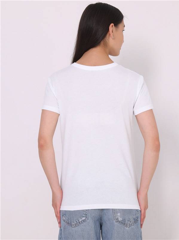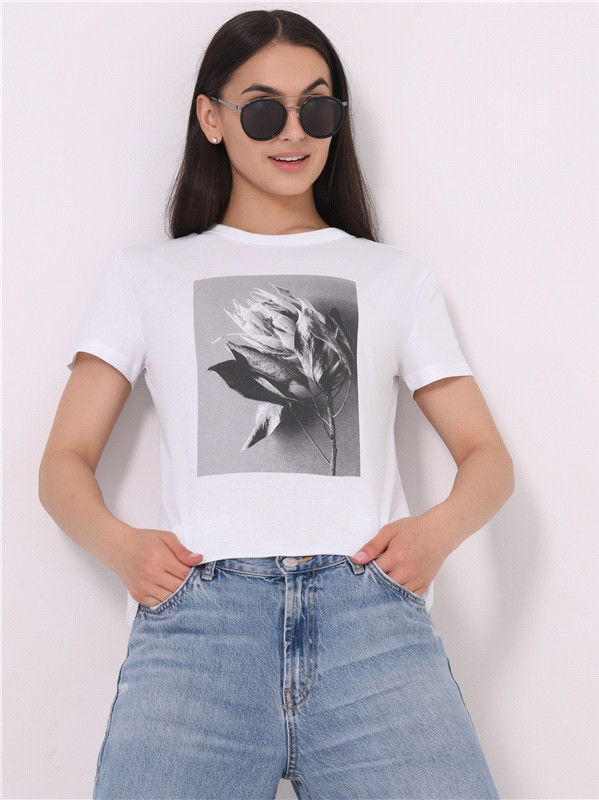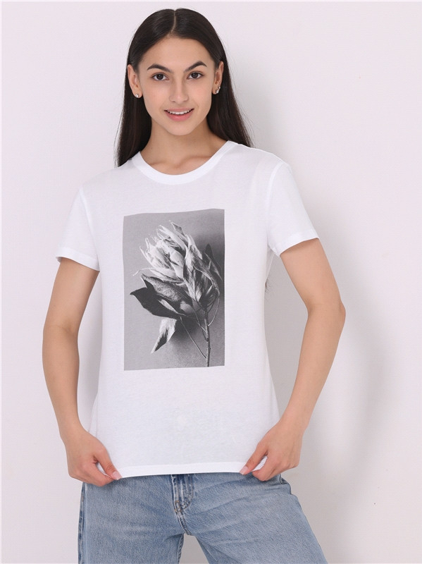 Футболка выполнена из кулира — легкого хлопкового полотна. Изделие свободного покроя с короткими рукавами и округлым вырезом горловины, украшено печатью.