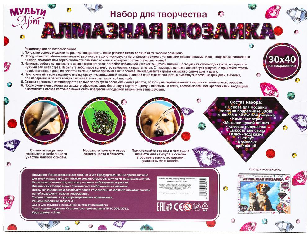 💳 Оплатить за товар можно при получении 🇰🇿 Есть бесплатная доставка по Казахстану 🎁 Копите бонусы с каждой покупки Набор для детского творчества – алмазная мозаика «Щенки ретривера» ТМ «Мульти Арт» - отличный подарок для ребёнка, который будет способствовать развитию его творческих способностей. |