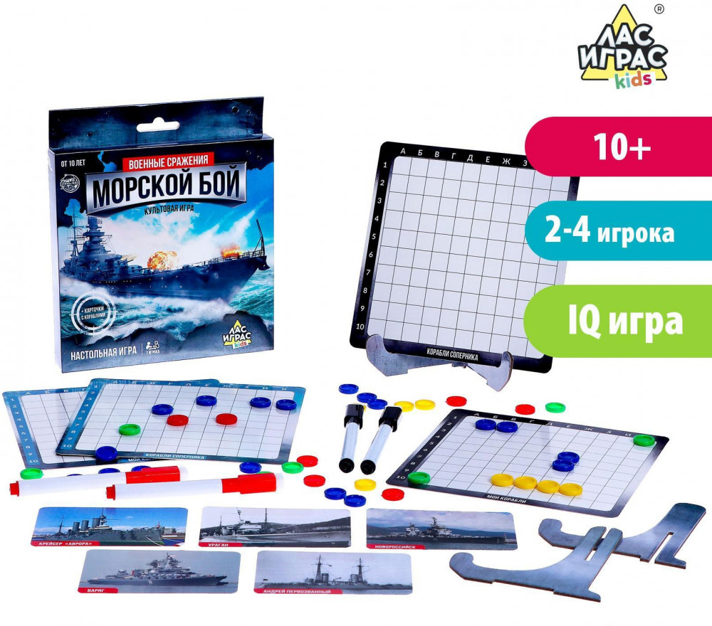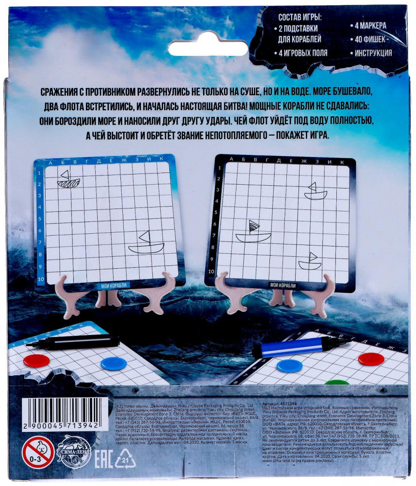 Насколько захватывающими могут быть морские сражения? Откройте для себя и своих близких настольную игру «Морской бой» и погрузитесь в мир баталий за безграничные водные дали! В игре могут участвовать два адмирала возрастом старше 10 лет. Каждый игрок берёт себе одну подставку, две карточки (для личного флота и флота противника) и по два маркера разных цветов. Все жетоны нужно разделить между соперниками поровну. Также в наборе вы найдете карточки с интересными фактами на морскую тематику.