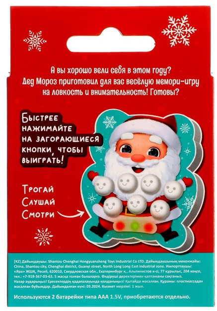 Игра способствует развитию моторики, координации движений и быстроты реакции у детей. Световые и звуковые эффекты делают процесс игры увлекательным и интересным. Пластиковый корпус обеспечивает долговечность и безопасность при использовании.