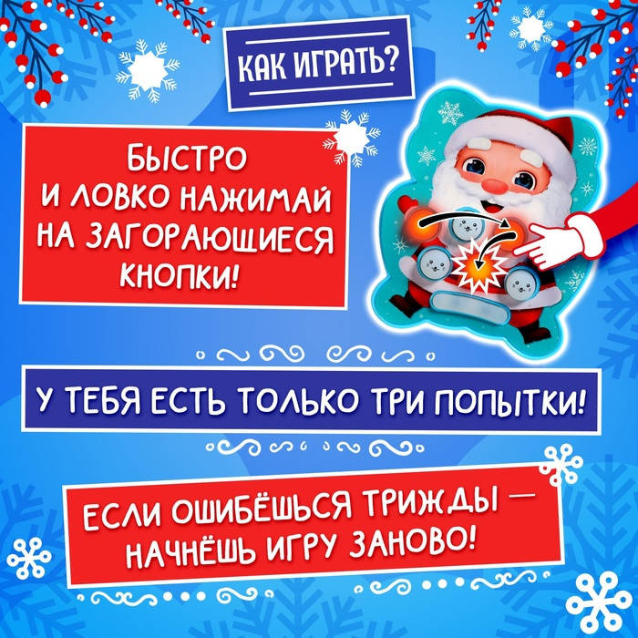 Включите игровую основу. На нижнем уровне загорится 3 кнопочки. У игрока ровно 3 жизни! Не растеряйте их — иначе игру придётся начать заново. Рекомендована детям старше 5 лет, рассчитана на 1 игрока.