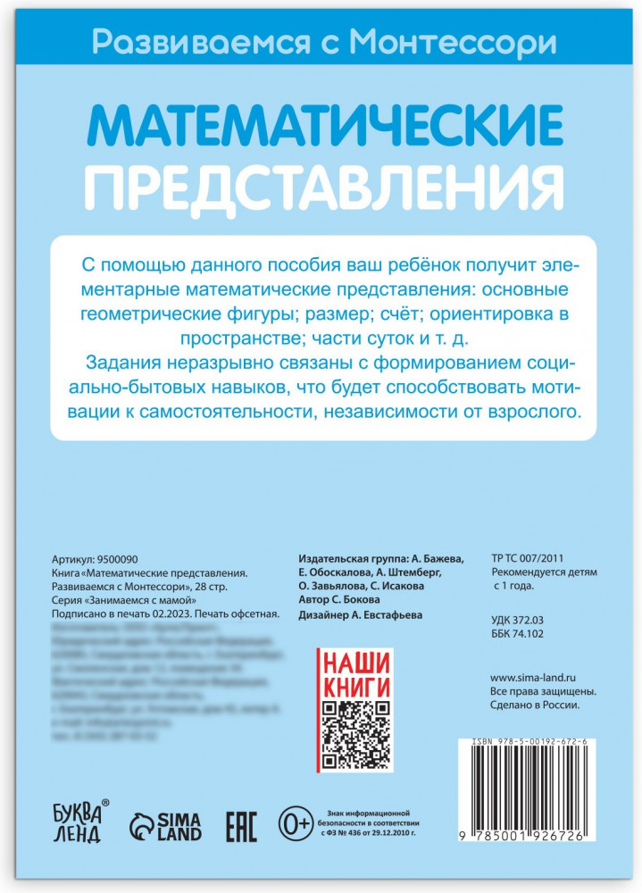 Серия: Занимаемся с мамой С книгой «Математические представления. Развиваемся с Монтессори» ребёнок познакомится с основными геометрическими фигурами, частями суток, научится сравнивать предметы по величине, освоит навыки счёта, ориентации в пространстве и получит другие элементарные математические представления. Задания неразрывно связаны с формированием социально-бытовых навыков, что будет способствовать мотивации к самостоятельности, независимости от взрослого. |