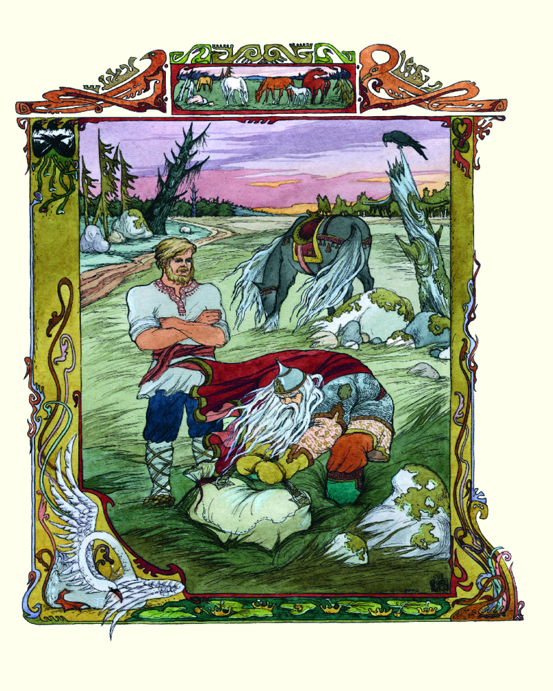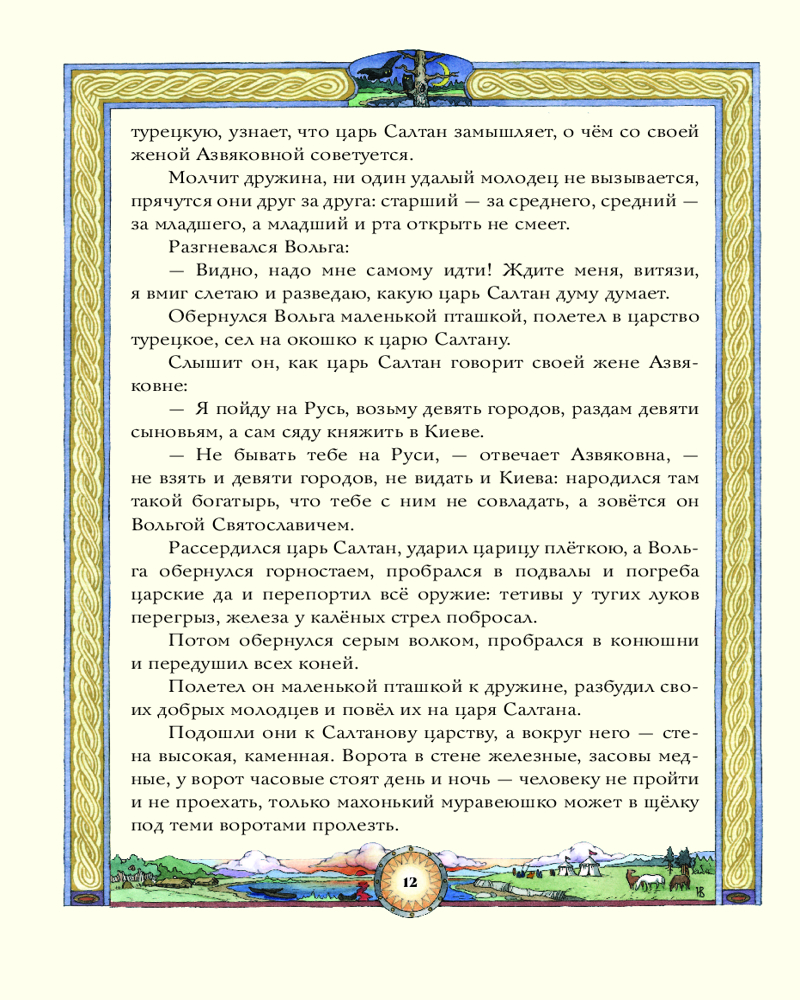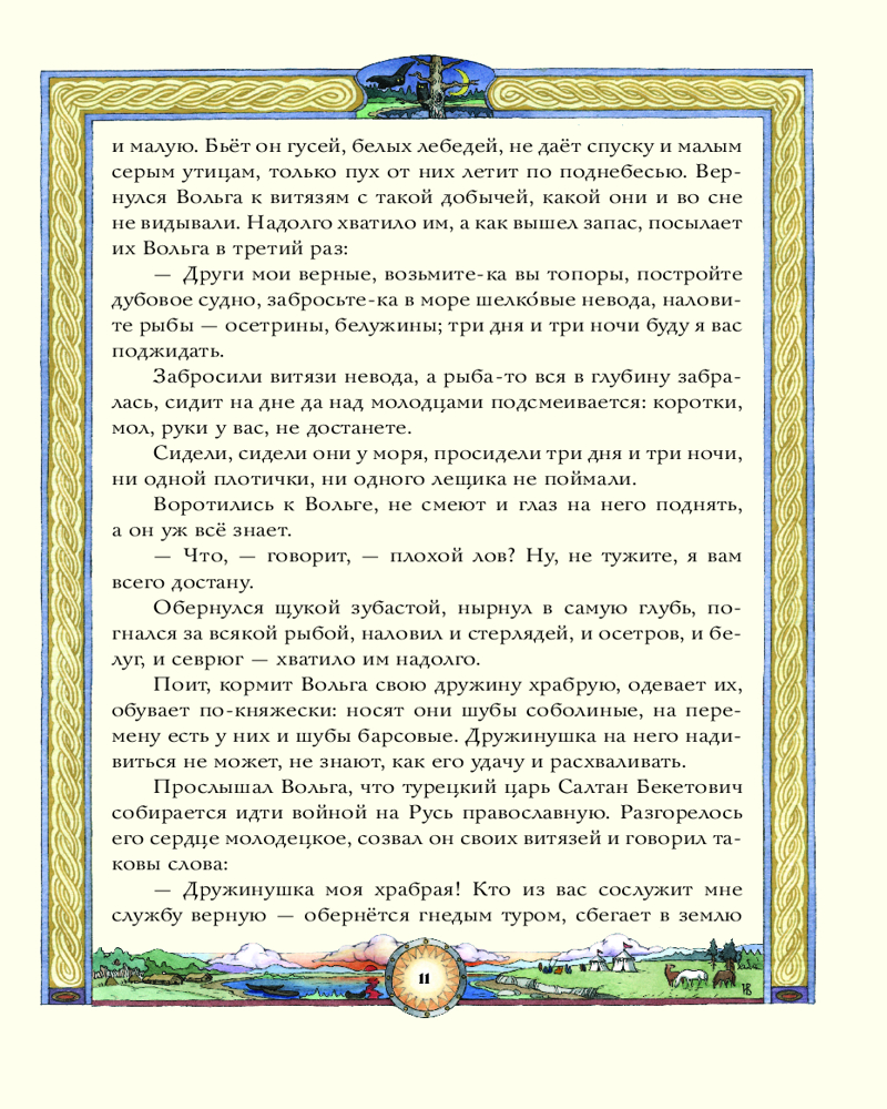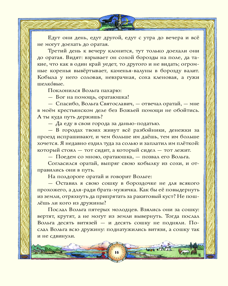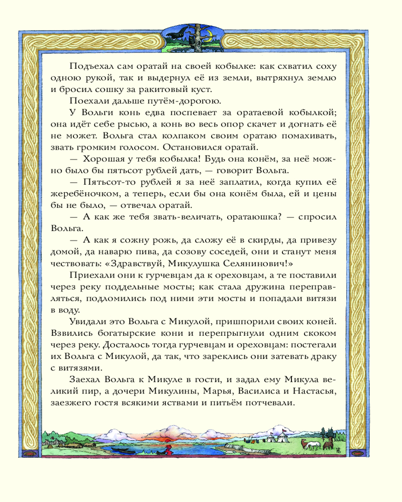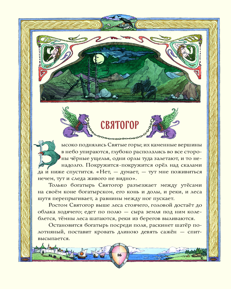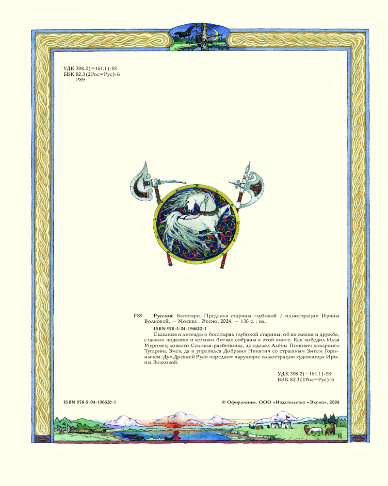 Серия: Золотые сказки для детей Подарочное издание большого формата. Твёрдый переплёт с тиснением фольгой. Плотная белая бумага. Чёткий, крупный шрифт. Полноцветные иллюстрации в фантазийном русском стиле. Славна была Русь богатырями — могучими воинами, защищавшими родную землю. Народная память сохранила их имена в легендах и преданиях, сказители передавали их из поколения в поколение. И столетия спустя потомки восхищаются великими подвигами былинных героев, их отвагой и верностью, их преданностью родине и семье. Не стареет честь и слава народных героев, а, значит, не оскудеет богатырями земля русская! Для более полного восприятия текста в конце книги приведён словарь редких и устаревших слов. Оригинальные, стильные иллюстрации созданы художницей Ириной Волковой. |