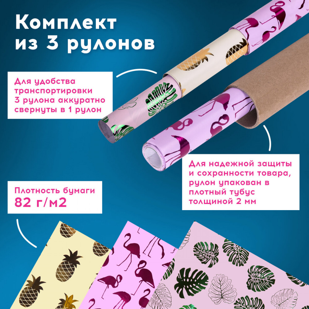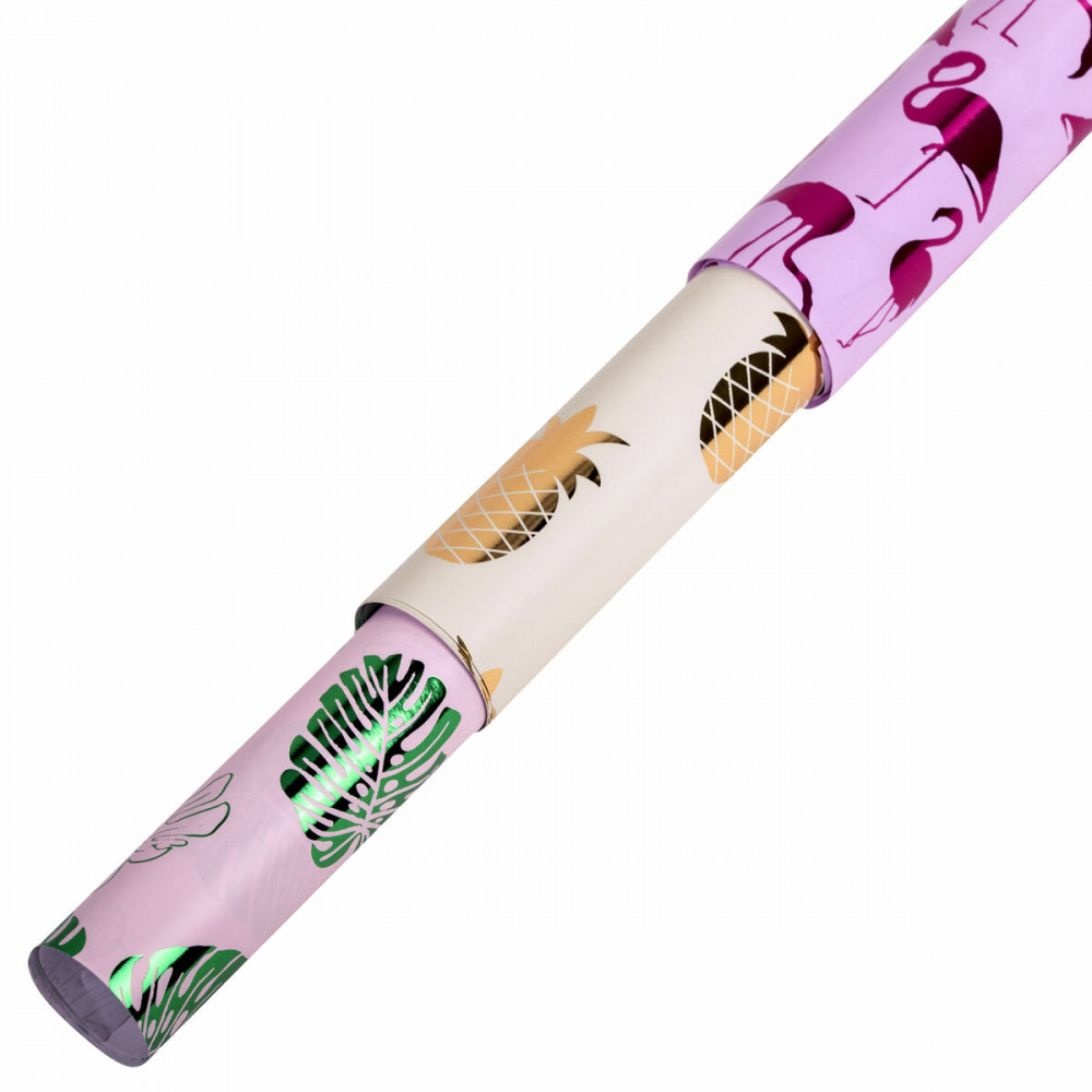 Набор из 3-х рулонов, каждый рулон — размером 70 × 100 см. Каждый из рулонов выполнен в оригинальном трендовом дизайне с ярким эффектом. Представляют собой мелованную бумагу с нанесенной на нее методом «хот стэмпинга» (горячего тиснения) фольгой с паттернами в виде фламинго, листьев, ананасов. Итоговая плотность бумаги — 82 г/м2. Рулоны свернуты в один и надежно упакованы в специальный картонный тубус, чтобы избежать всякого рода повреждений или замятий бумаги в процессе транспортировки.