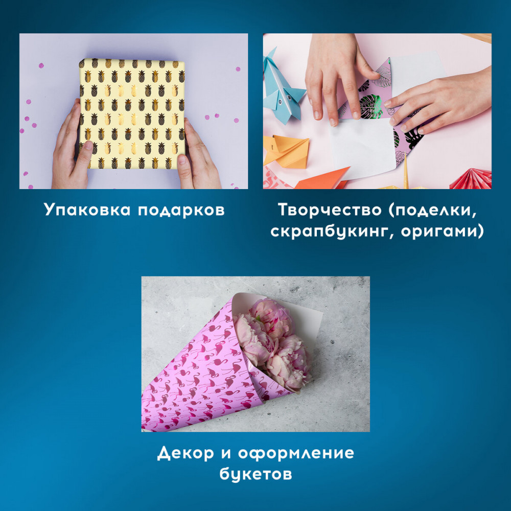 Набор упаковочной бумаги с разноцветным фольгированием «Colorful Tropics» отлично подходит для упаковки подарков, а также для рукоделия, декора и других дизайнерских решений. Упаковочная бумага — отличный способ придать особый статус подарку, а также ее можно использовать в творчестве для различных поделок, оригами, скрапбукинга.