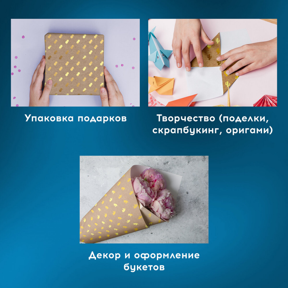 Набор упаковочной крафт-бумаги с золотистым фольгированием «Trendy Kraft» отлично подходит для упаковки подарков, а также для рукоделия, декора и других дизайнерских решений. Упаковочная бумага — отличный способ придать особый статус подарку, а также ее можно использовать в творчестве для различных поделок, оригами, скрапбукинга. |