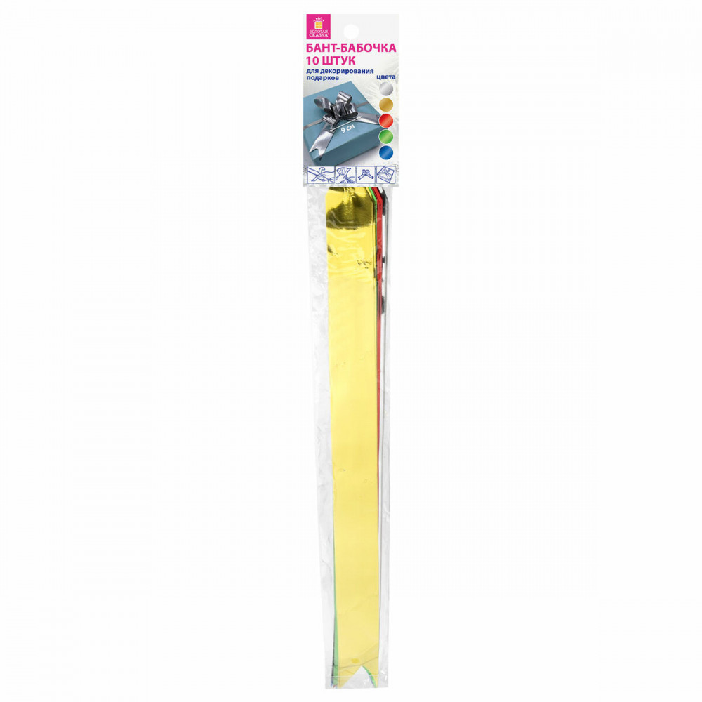 Банты-бабочки Золотая сказка — идеальный вариант для тех, кто считает, что каждый подарок должен быть уникальным и выделяться из массы других своей оригинальностью. Набор состоит из 10-ти бантов-бабочек в пяти цветах с эффектом металлик: серебристый, золотистый, красный, зеленый, синий. Ширина ленты — 3 см, длина ленты в разобранном виде — 47 см. Банты выполнены из прочного полипропилена (70%), полиэтилена (15%) и полиэтилентерефталата (15%). Диаметр банта в собранном виде около 9 см.