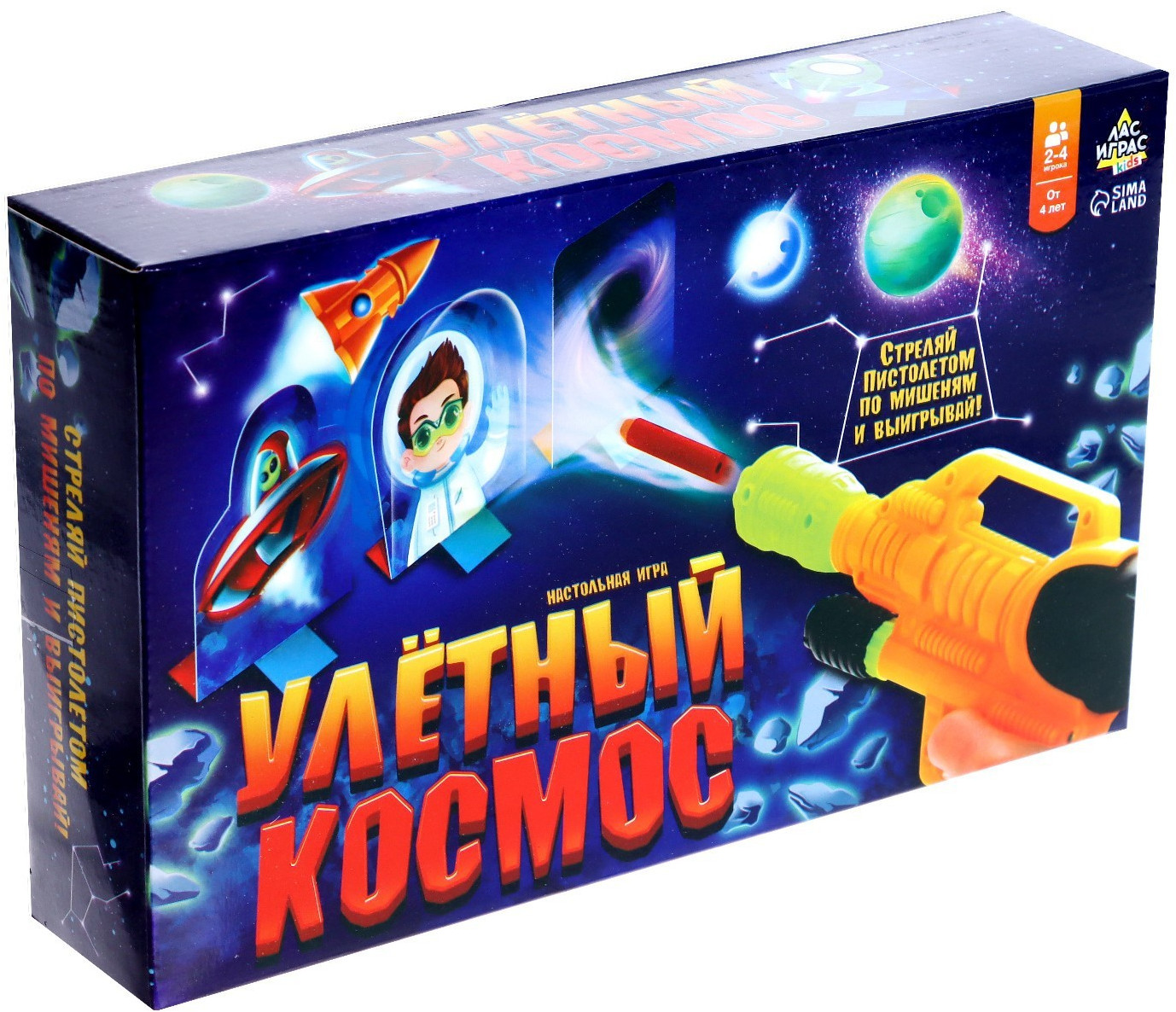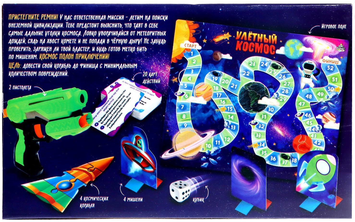 Эта настольная игра отправит малыша в настоящее космическое путешествие. Ребёнку предстоит уворачиваться от метеоритных дождей и не попасть в чёрную дыру! Не забудьте проверить, заряжен ли бластер? Ведь бить по мишеням придётся метко. Цель игры: довести космический корабль до финиша с наименьшим количеством повреждений!
