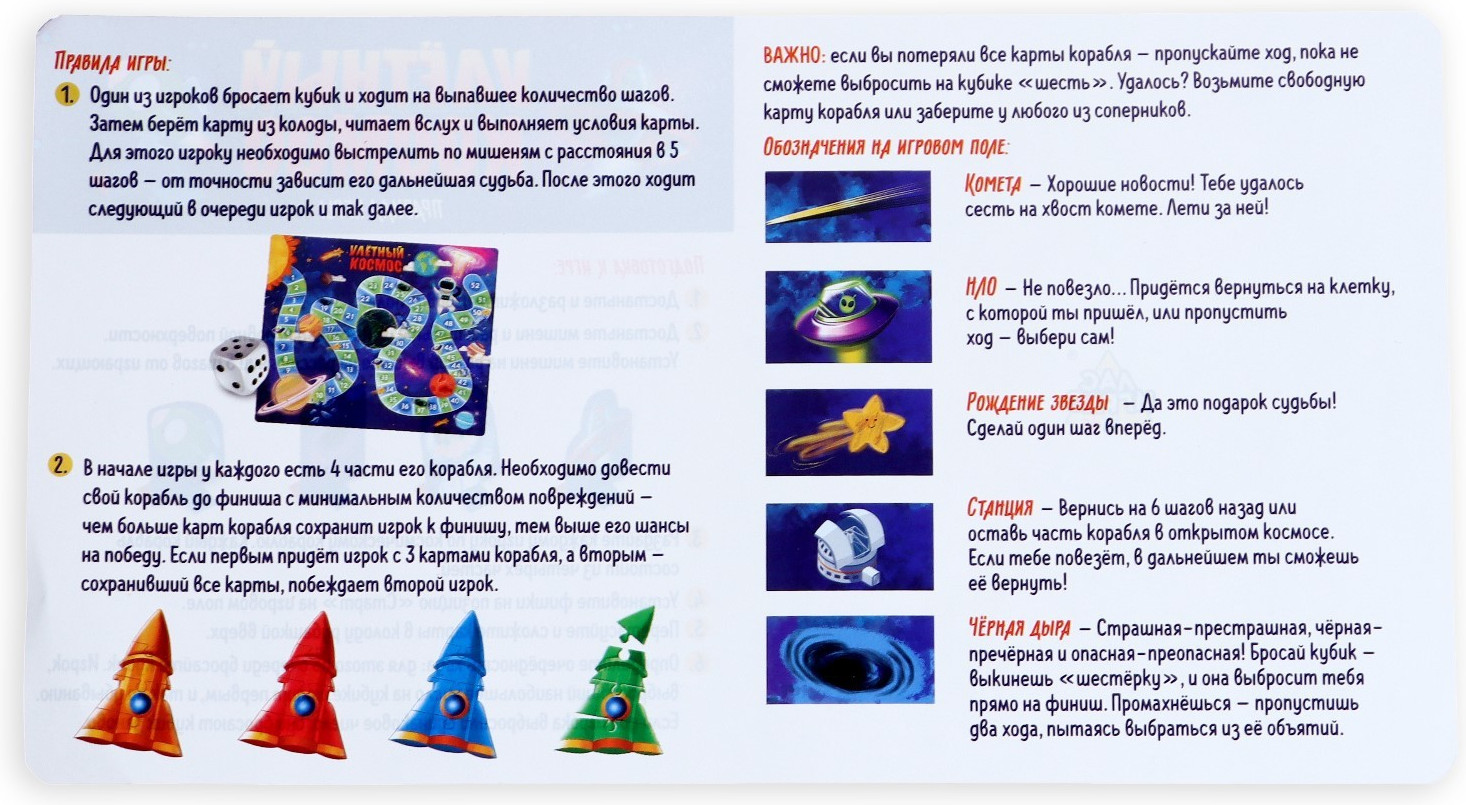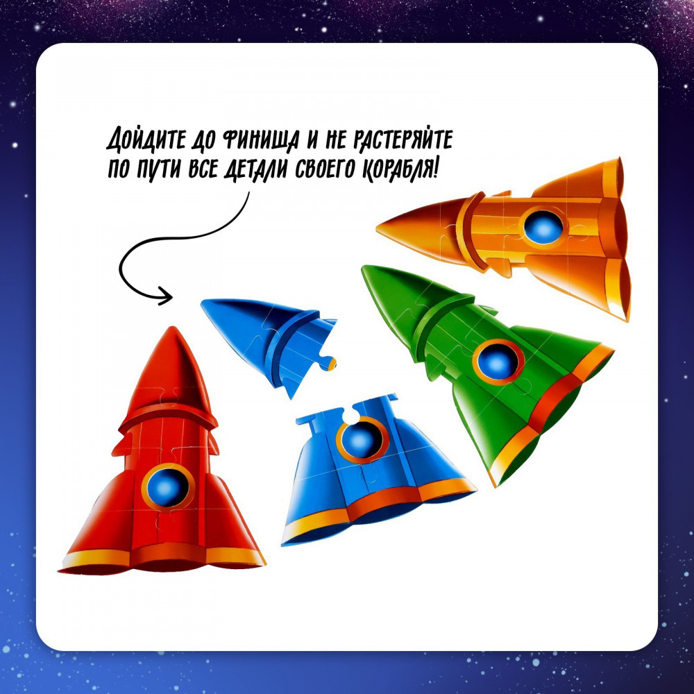 • у каждого юного космонавта в запасе есть 4 части его корабля. Чем больше карт корабля сохранит игрок к финишу, тем выше его шансы на победу;