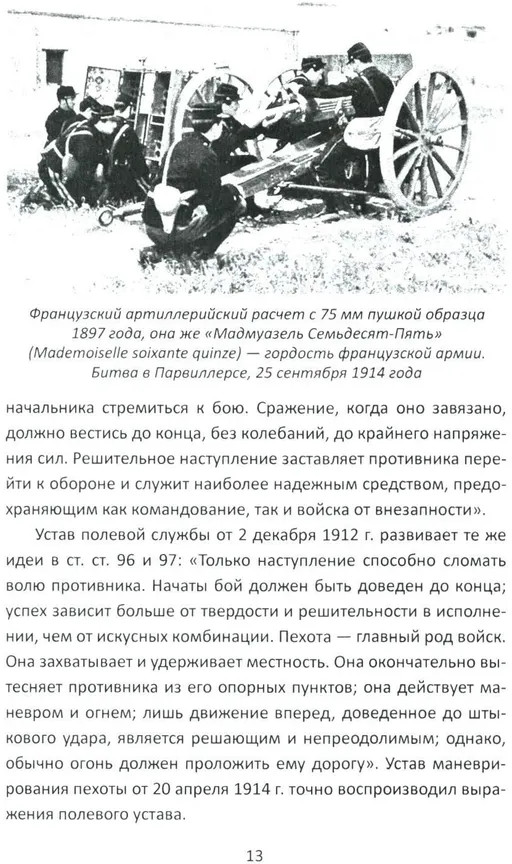 Огневой вал. Артиллерия в прошлом, настоящем и будущемВ данный момент этот товар отсутствует в продаже. Возможно, у нас найдется аналогичный или похожий товар здесь. Серия: Война и мир Французские теоретики ещё в 1892 году видели будущую войну быстрой и наступательной, а ключами к победе в offensive a I’outrance (наступлении «до предела») — техническое и «моральное превосходство французского солдата» вкупе с галльской традицией ведения наступательных боевых действий или elan — то есть наступление энергичное и с энтузиазмом. Французская военная доктрина полагала, что «артиллерия должна быть легкой и скорострельной, чтобы ее можно быстро отправить в решающее место боя. Более тяжелые орудия дольше доставлять на позиции, а их больший в сравнении с полевой пушкой заряд компенсируется тем, что тяжелое орудие дольше перезаряжать, соответственно, и стреляет оно реже». Очень быстро французы вынужденно познакомились с немецкой дальнобойной артиллерией и поняли, что война пойдет не по их плану. |