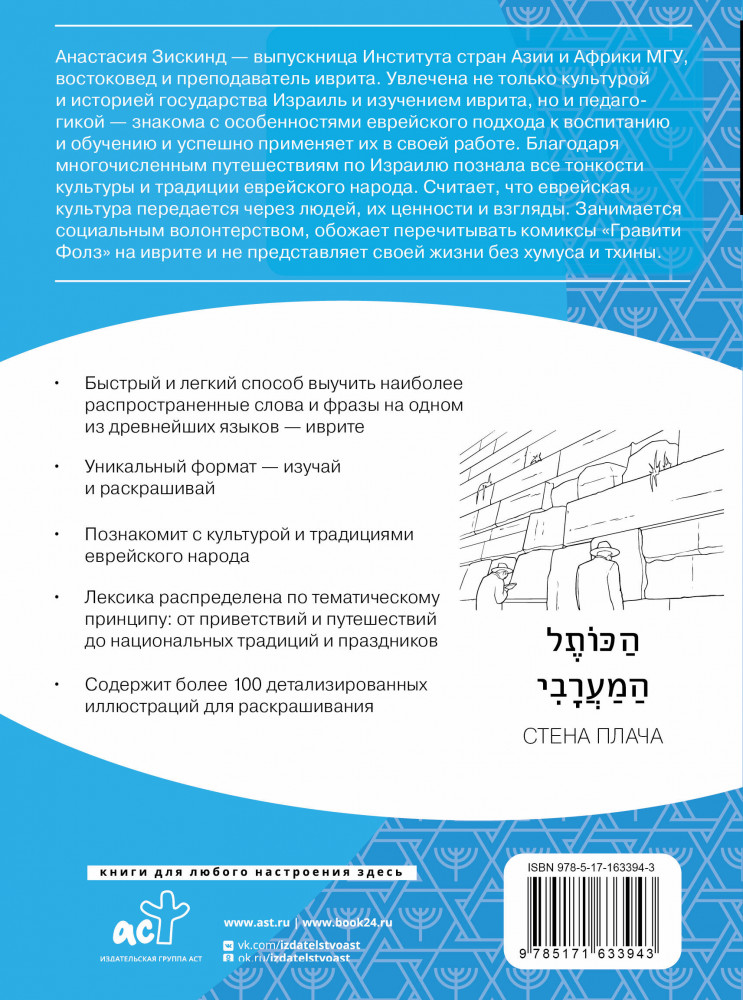 Серия: Изучаем лексику. Визуальный словарь-раскраска Анастасия Зискинд — выпускница института стран Азии и Африки МГУ, востоковед и преподаватель иврита. Увлечена не только культурой и историей государства Израиль и изучением иврита, но и педагогикой — знакома с особенностями еврейского подхода к воспитанию и обучению и успешно применяет их в своей работе. Благодаря многочисленным путешествиям по Израилю познала все тонкости культуры и традиции еврейского народа. Считает, что еврейская культура передается через людей, их ценности и взгляды. Занимается социальным волонтерством, обожает перечитывать комиксы «Гравити Фолз» на иврите и не представляет своей жизни без хумуса и тхины. |