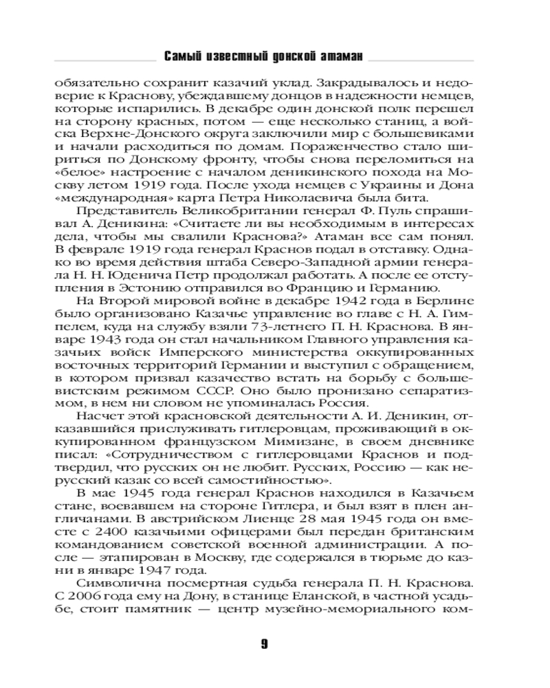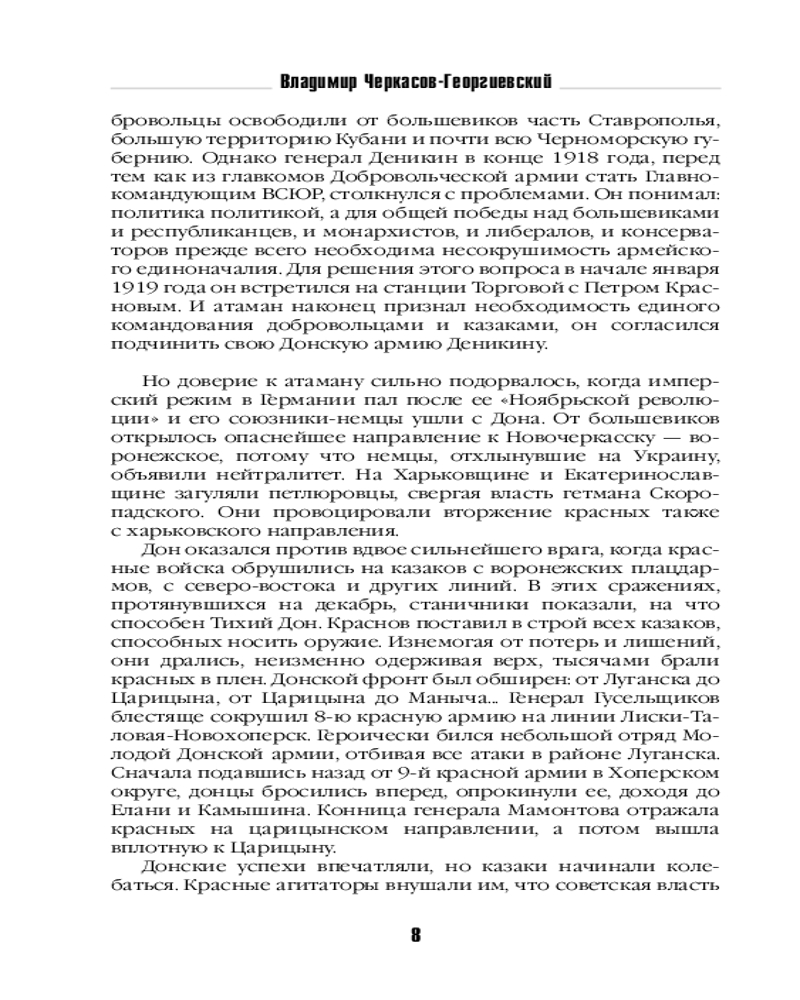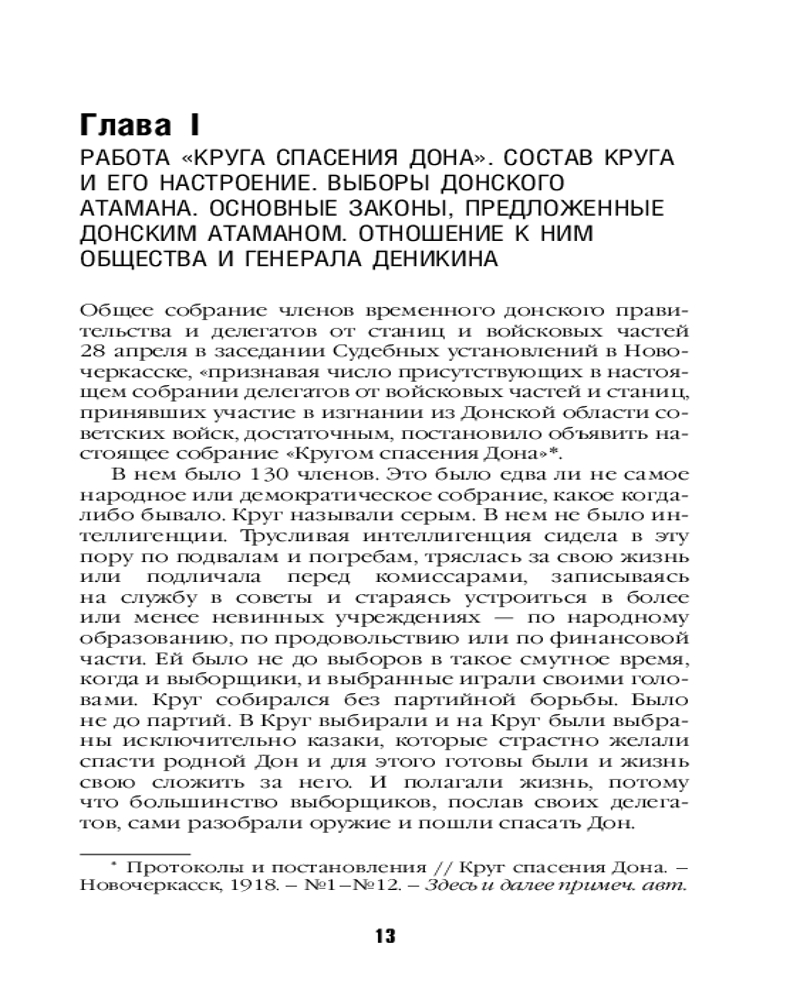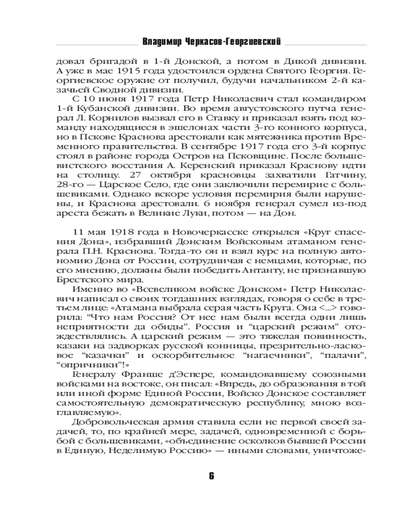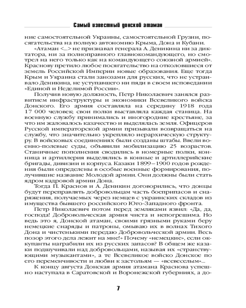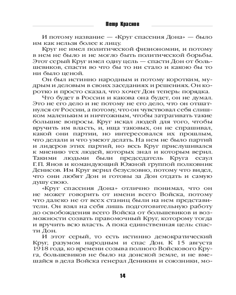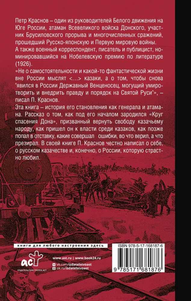 «Не о самостоятельности и какой-то фантастической жизни вне России мыслят <...> казаки, а о том, чтобы снова «явился в России Державный Венценосец, могущий умиротворить и внедрить правду и порядок на Святой Руси», — писал П. Краснов. Эта книга — история его становления как генерала и атамана. Рассказ о том, как под его началом зародился «Круг спасения Дона», призванный вернуть свободу казачьему народу, как пришел он к власти среди казаков, как позже попал в отставку, какие совершал ошибки, во что верил, а что презирал. В своей книге П. Краснов честно написал о себе, о русском казачестве и, конечно, о России, которую страстно любил. |