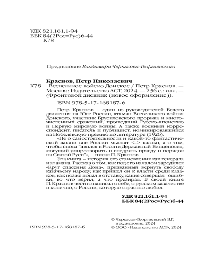 В данный момент этот товар отсутствует в продаже. Возможно, у нас найдется аналогичный или похожий товар здесь. Серия: Фронтовой дневник (новое оформление) Петр Краснов — один из руководителей Белого движения на Юге России, атаман Всевеликого войска Донского, участник Брусиловского прорыва и многочисленных сражений, прошедший Русско-японскую и Первую мировую войны. А также военный корреспондент, писатель и публицист, номинировавшийся на Нобелевскую премию по литературе (1926).