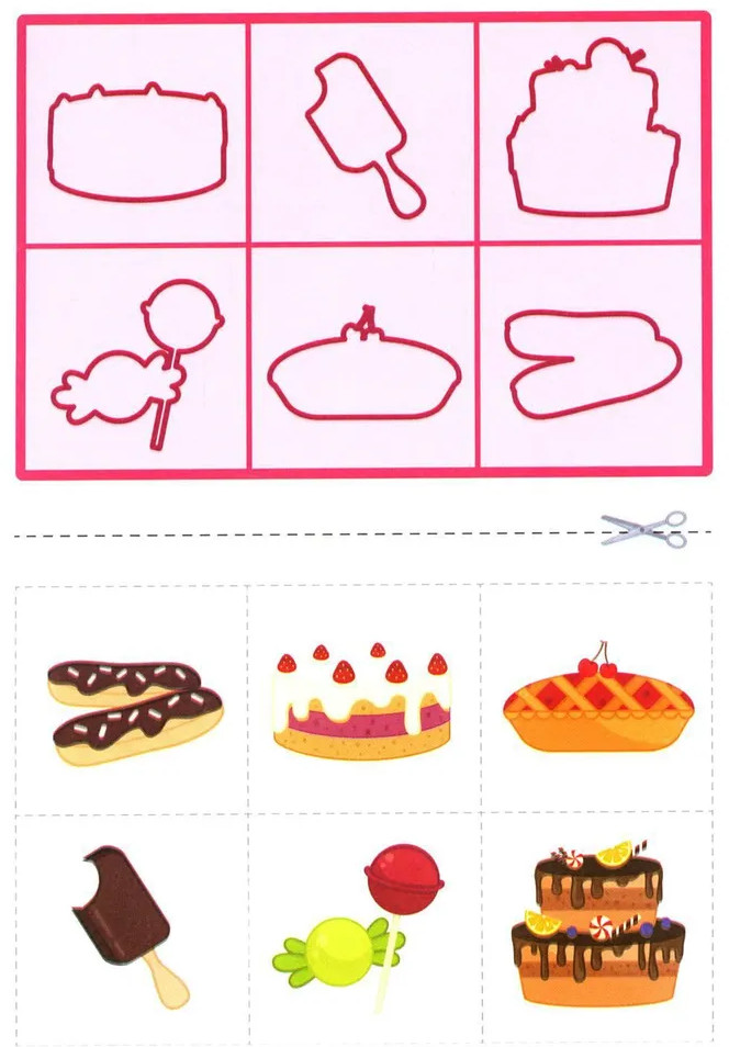 2. Объясните малышу, что надо сначала вырезать картинку по пунктирной линии, найти контур рисунка и приклеить его на это место.