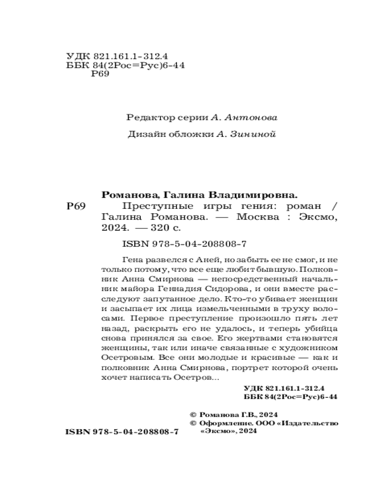 Серия: Детективы Галины Романовой. Метод Женщины. Новое оформление (обложка) Гена развелся с Аней, но забыть ее не смог, и не только потому, что все еще любит бывшую. Полковник Анна Смирнова — непосредственный начальник майора Геннадия Сидорова, и они вместе расследуют запутанное дело. Кто-то убивает женщин и засыпает их лица измельченными в труху волосами. Первое преступление произошло пять лет назад, раскрыть его не удалось, и теперь убийца снова принялся за свое. Его жертвами становятся женщины, так или иначе связанные с художником Осетровым. Все они молодые и красивые — как и полковник Анна Смирнова, портрет которой очень хочет написать Осетров... |