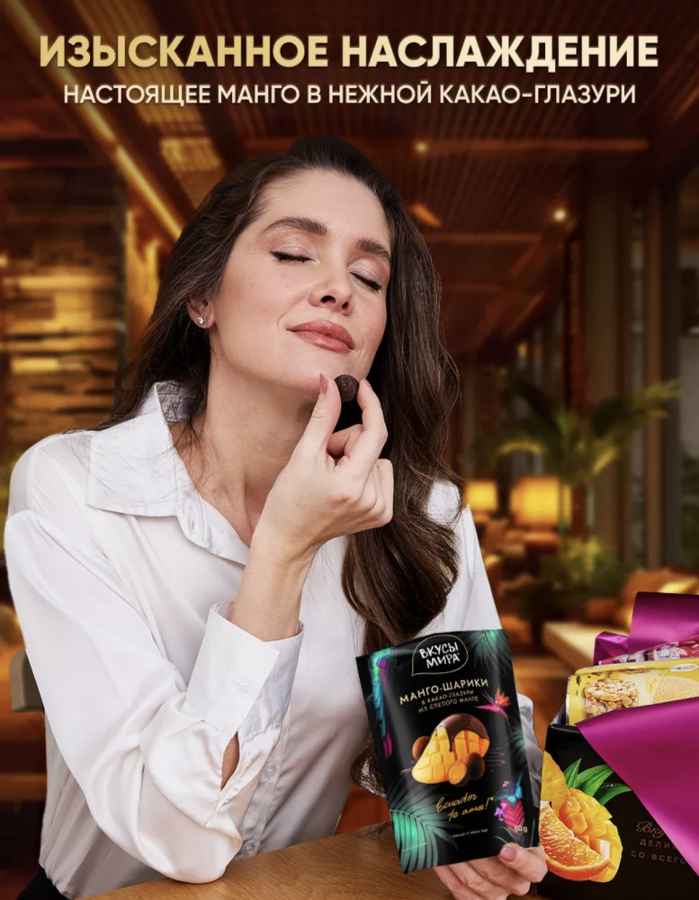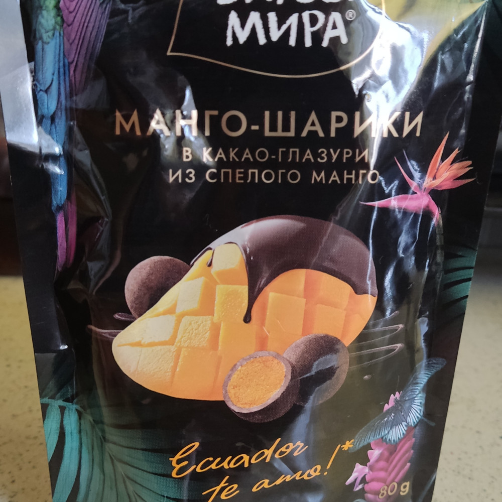 В составе манго-шариков в шоколаде Вкусы Мира натуральное сушеное манго, какао-глазурь и немного сахара.