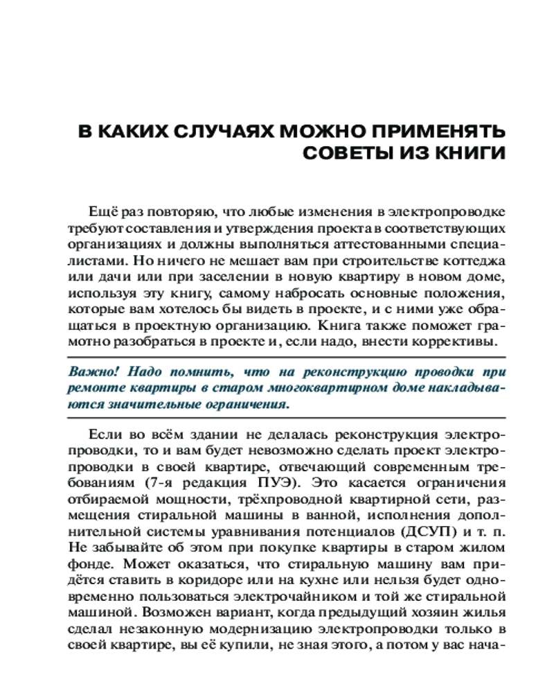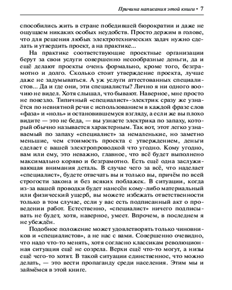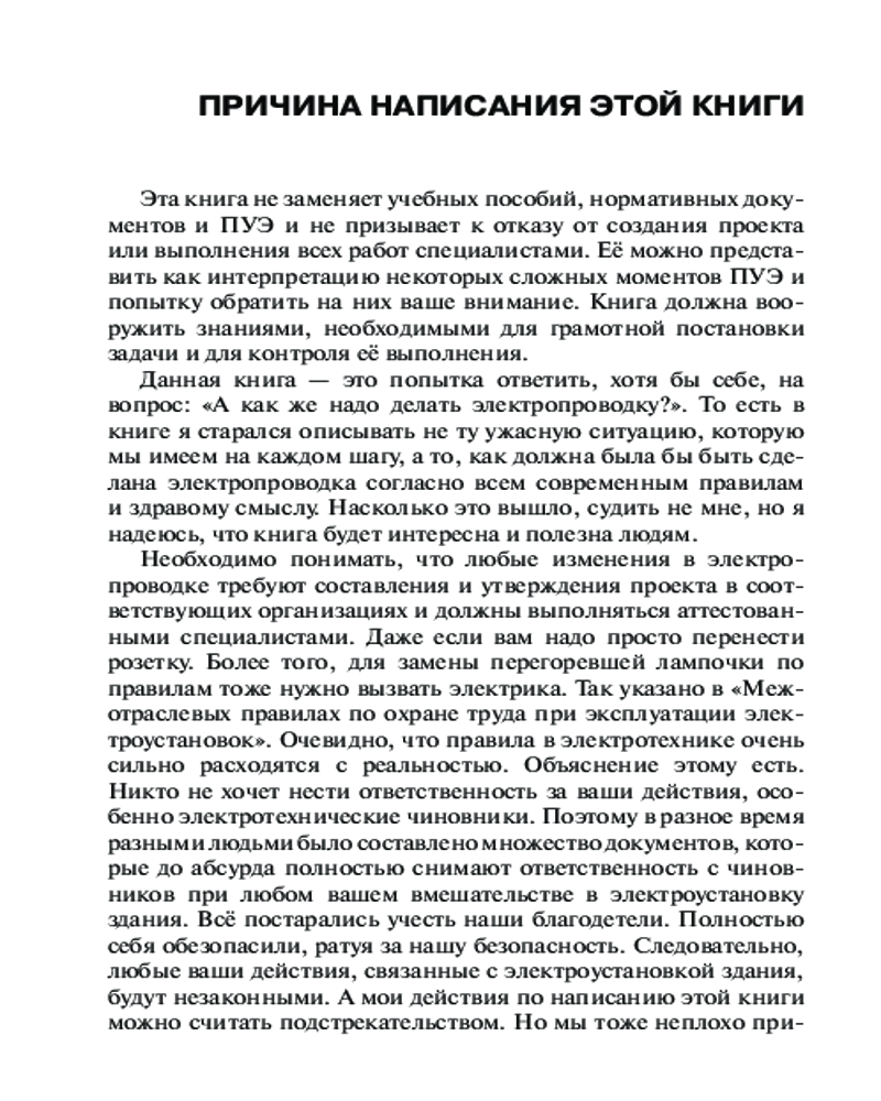 Книга представляет собой пособие по устройству и монтажу бытовой электропроводки. Принятие в 2002 году 7-й редакции ПУЭ (Правил Устройства Электроустановок) стало своего рода «тихой революцией» в России. Предложенный в ней новый революционный подход всколыхнул страну. Новый подход на первый взгляд отрицает старую парадигму, хотя это не так. И чтобы разобраться в путанице, требуются достаточно глубокие знания электротехники уже не только от электриков, но и от простых граждан. |