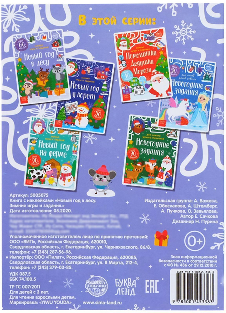 Новый год в лесу. Зимние игры и заданияВ данный момент этот товар отсутствует в продаже. Возможно, у нас найдется аналогичный или похожий товар здесь. Серия: Новогодние книги Буква-Ленд Эта книга создана специально для любителей клеить наклейки и выполнять интересные задания. Занятия с книгой помогут весело и с пользой провести время в ожидании праздника. Внутри ребёнка ждут увлекательные задания, милые персонажи и более 60 наклеек. Чтобы малыш не запутался, на листе с наклейками есть подсказки. Рекомендуется детям с 3 лет. Выполняя задания в книге, малыш тренирует мелкую моторику, аккуратность, усидчивость, а также пространственное мышление и сообразительность. |