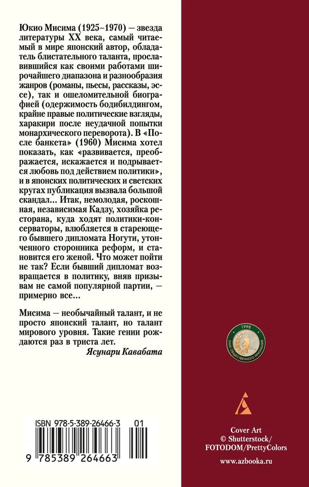 Юкио Мисима (1925–1970) — звезда литературы XX века, самый читаемый в мире японский автор, обладатель блистательного таланта, прославившийся как своими работами широчайшего диапазона и разнообразия жанров (романы, пьесы, рассказы, эссе), так и ошеломительной биографией (одержимость бодибилдингом, крайне правые политические взгляды, харакири после неудачной попытки монархического переворота).
