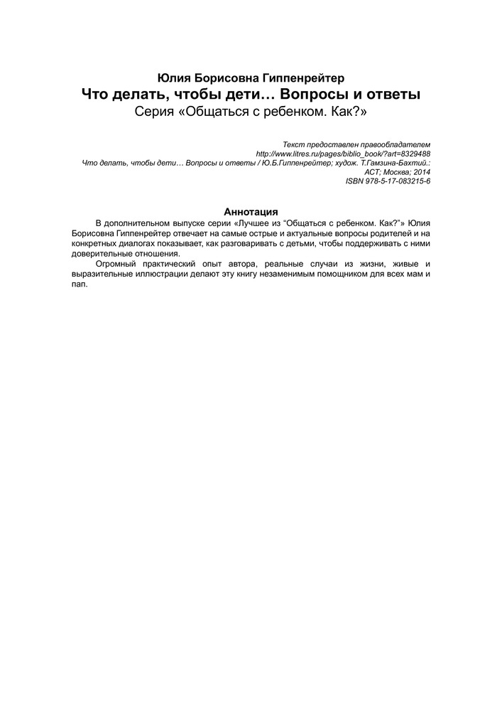 Что делать, чтобы дети... Вопросы и ответыВ данный момент этот товар отсутствует в продаже. Возможно, у нас найдется аналогичный или похожий товар здесь. Серия: Гиппенрейтер В дополнительном выпуске серии «Лучшее из «Общаться с ребенком. Как?» Юлия Борисовна Гиппенрейтер отвечает на самые острые и актуальные вопросы родителей и на конкретных диалогах показывает, как разговаривать с детьми, чтобы поддерживать с ними доверительные отношения. |