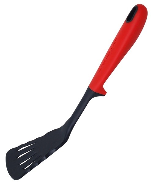 Купила сразу 5 предметов этой серии. Чёрный и красный цвета создают прекрасный контраст. Благодаря нержавеющей стали ручки крепкие, не гнутся. Рабочая поверхность из силикона качественная - достаточно плотная, при соприкосновении с горячим нет никакого запаха! В ручке каждого инструмента есть держатель, благодаря чему, "грязная" его часть остаётся на весу и не пачкает стол. Общая длинна инструментов 33 см, что защищает руки от горячего пара и брызг.