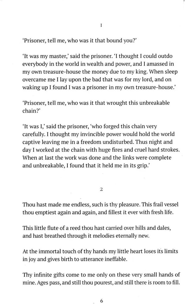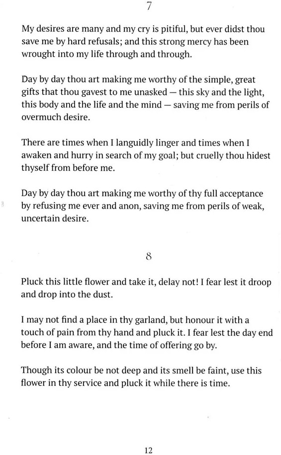 «Гитанджали» — это сборник стихов бенгальского поэта Рабиндраната Тагора. В 1913 году Тагор стал первым неевропейцем, получившим Нобелевскую премию, в частности Нобелевскую премию по литературе, в основном за английское «Гитанджали». Английский «Гитанджали» стал очень известным на Западе и был широко переведен. Слово гитанджали состоит из «гит», песни, и"анджали«, подношения, и, таким образом, означает «подношение песен»; но слово, обозначающее подношение, анджали, имеет сильный религиозный оттенок, поэтому название также может быть истолковано как «молитвенное подношение песни». |