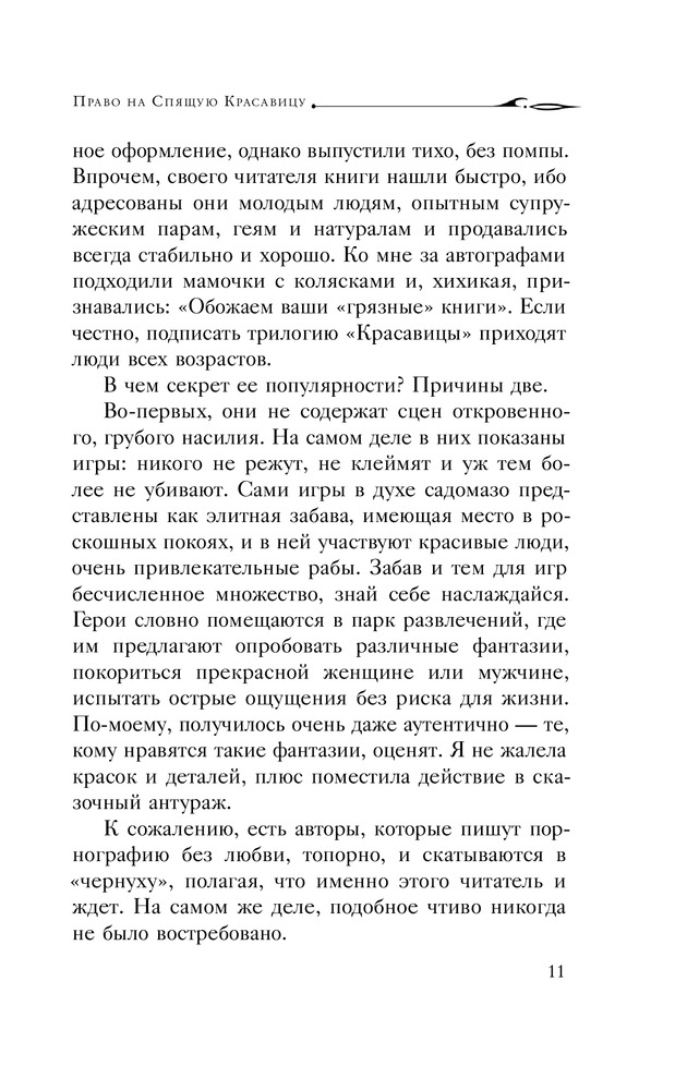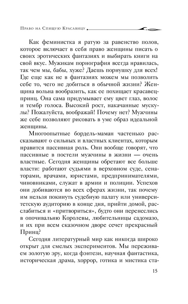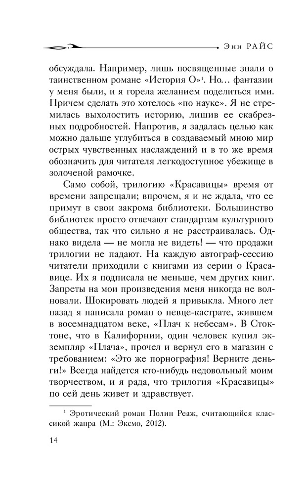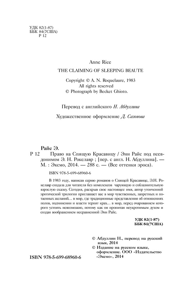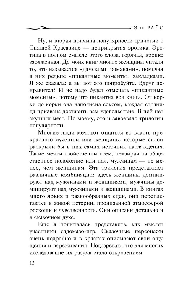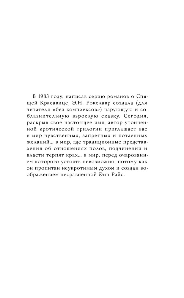 В данный момент этот товар отсутствует в продаже. Возможно, у нас найдется аналогичный или похожий товар здесь. Серия: Все оттенки эроса В 1983 году, написав серию романов о Спящей Красавице, Э. Н. Рокелавр создала для читателя без комплексов чарующую и соблазнительную взрослую сказку. Сегодня, раскрыв свое настоящее имя, автор утонченной эротической трилогии приглашает вас в мир чувственных, запретных и потаенных желаний… в мир, где традиционные представления об отношениях полов, подчинении и власти терпят крах… в мир, перед очарованием которого устоять невозможно, потому как он пропитан неукротимым духом и создан воображением несравненной Энн Райс. |